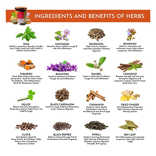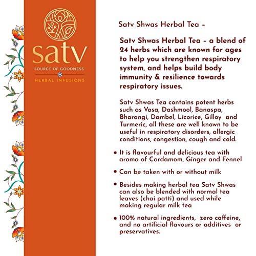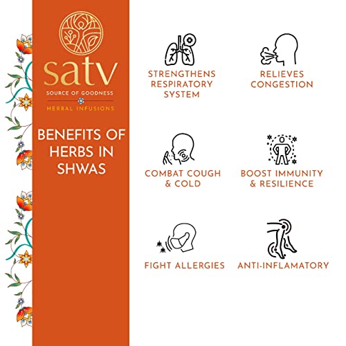• HERBS: Satv Shwas Tea contains potent herbs such as Vasa Dashmool Banaspa Bharangi Dambel Licorice Gilloy and Turmeric