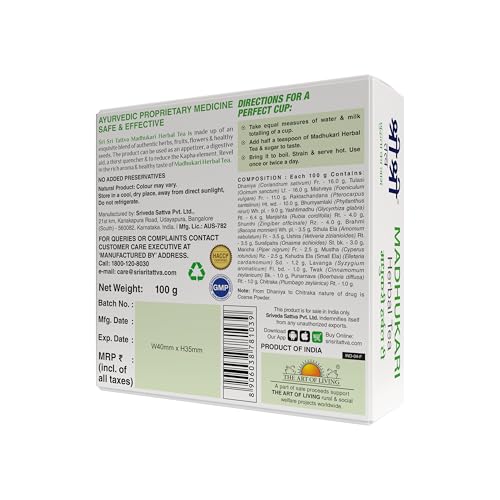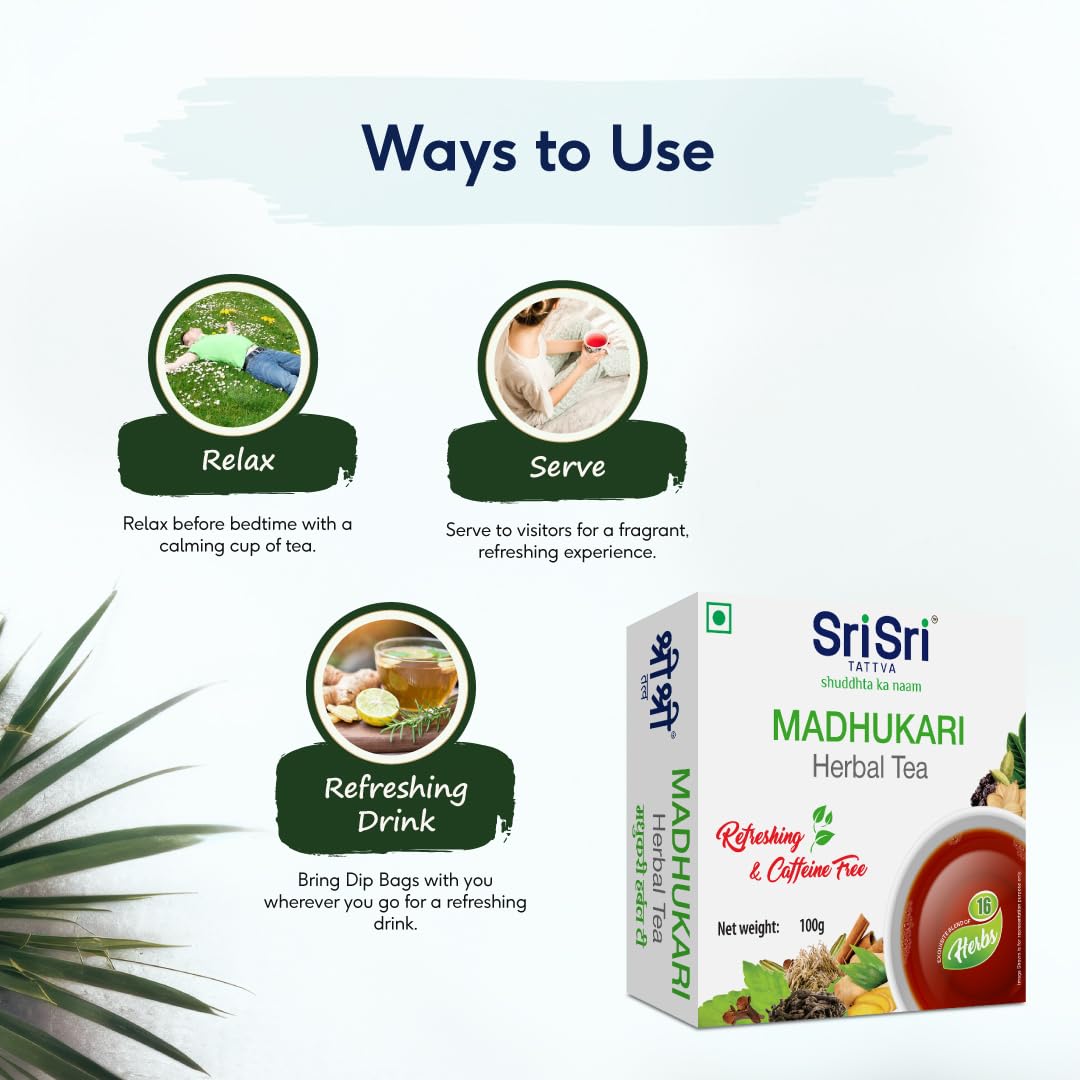 • Sri Sri Tattva madhukari herbal tea is an exquisite blend of 16 exotic herbs; The combination of these herbs act as appetizer digestive aid and helps in kapha imbalances