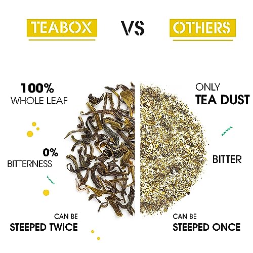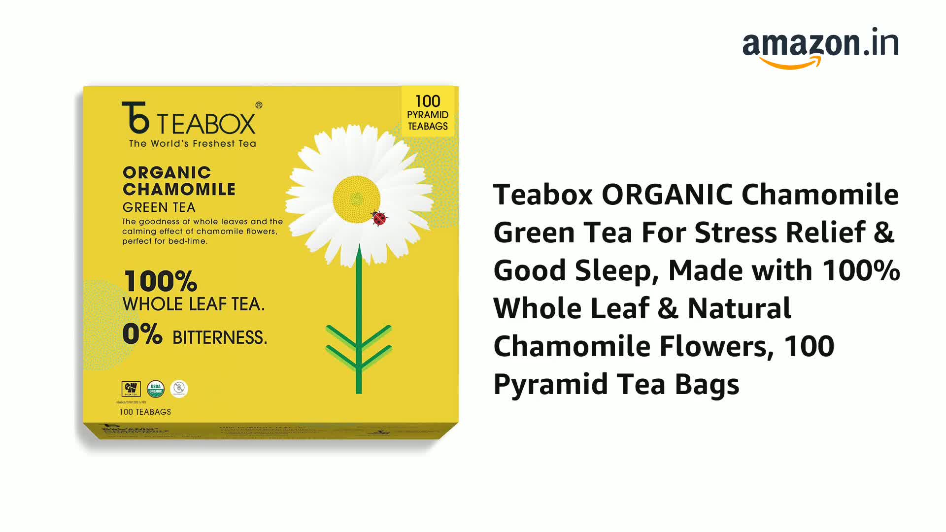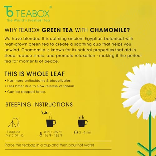 Teabox Premium Organic Green Tea With Chamomile Flowers | 100% Whole Leaf Green Tea Leaves With Whole Chamomile Flower | 0% Bitterness | USDA ORGANIC | 100 Tea Bags (Low Caffeine)