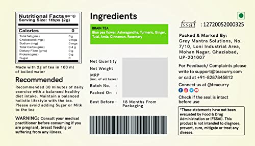 Teacurry Brain Tea consists of premium quality Butterfly Pea flowers Turmeric Ginger Tulsi Amla and Rosemary. These pure flowers of the Clitoria Ternatea plant are sourced from the islands of Andaman. Butterfly pea Kordofan pea blue pea paratha and Asian pigwings are common names of this plant which form the base of Teacurry Brain Tea. Teacurry Brain Tea is 100% natural and assists with and Memory. Being naturally caffeine-free and a completely herbal concoction Brain Tea contains significant amounts of catechin as well as a host of anti-and -ing ingredients. Teacurry Brain Tea improves memory and concentration level. Butterfly Pea has been shown to enhance cognitive function and brain function. Teacurry Brain Tea assists with . Teacurry Brain Tea is 100 percent natural. The best tea for can be preferred with honey but without milk and sugar. Teacurry Brain Tea can also be consumed or iced. Brain Tea can be enjoyed both hot and . Clitoria Ternatea has been used for centuries to enhance memory brain power and . This instant Tea is extremely rich in antiand flavonoids. Best brain tea is a caffeine-free herbal Tea which Increases Memory and improves .