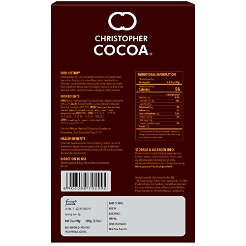 This is a pack of Christopher Cocoa Dark Chocolate Chips 200g. Christopher Cocoa is a tribute to the adventure that 'discovered' cacao beans which led to the modern indulgence called chocolate.