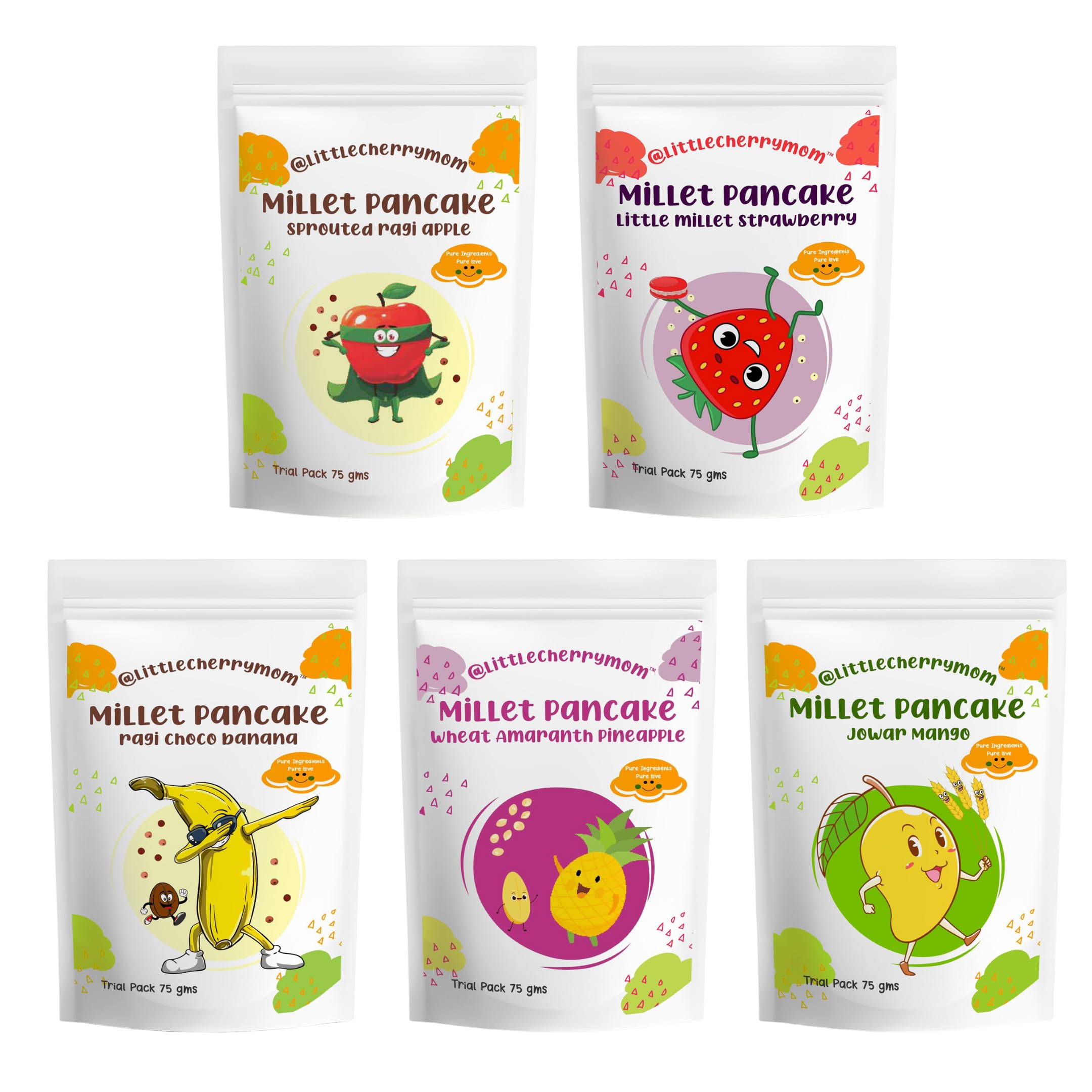 Enjoy and Try all five flavours (Sprouted Ragi pple, Jowar Mango, Little Millet Strawberry, Ragi Choco banana and Wheat Amaranth Pineapple) of our healthy and yummy pancakes with the Pancake Trial Combo Pack