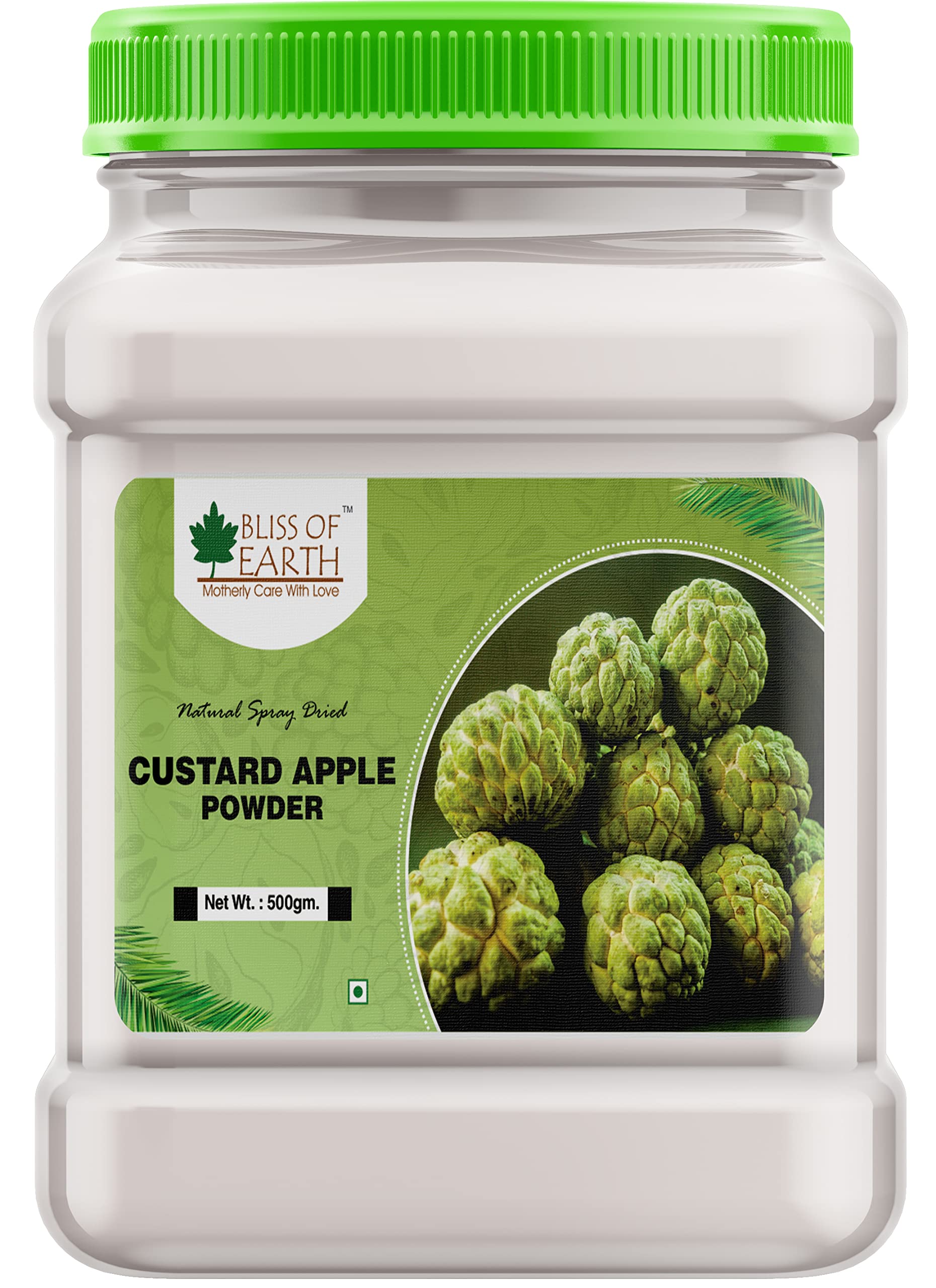 Bliss of Earth Custard apple powder is made using spray dried method from organic custard apples also known as "sitaphal" in hindi. it is a delicious fruit that is popular for its creamy sweet flesh. This soft and creamy fruit has a hard rind and is full of nutrients. The fruit contains antioxidants and is high in nutrients like magnesium and potassium offering a plethora of health benefits. Custard apples are a rich source of nutrients and minerals required by the body