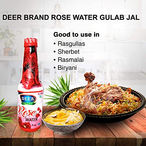 DEER BRAND Rice Dishes & Mughlai Dishes Water use in Biryani PulaoFried Rice Milkshakesice-creamRasmalaiSharbatRasgullaSweet Dishes-Desserts (Rose Water Gulab Jal. Rose water is a liquid made from distilling rose petals. It has a subtle floral scent and is often used in perfumes skin care products and cooking. In skincare it is used as a toner or a mist to hydrate and refresh the skin and can also help reduce redness and inflammation. In cooking it is used to add flavor to desserts and drinks. It is also believed to have medicinal properties and is sometimes used in traditional medicine. Kewra water is a fragrant and flavorful water extracted from the flowers of the Pandanus plant also known as kewra or screw pine. It is commonly used in Indian and Pakistani cuisine as a flavoring agent in sweet dishes such as desserts and syrups. The water has a unique and delicate aroma with notes of rose and jasmine. It is also used in traditional Ayurvedic medicine as a cooling and soothing agent for the body. Kewra water is typically sold in bottles or as a concentrated extract that can be diluted before use.