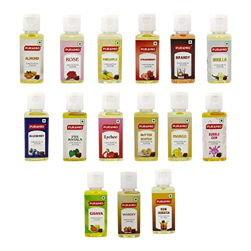 Puramio Chocolate Oil Flavour Combo (Pack of 15) 50ml Each (Brandi Guava Lychee Rose Rum Vanilla Whisky Blueberry Pan Masala Almond Pineapple Bubble Gum Strawberry Mango Butterscotch)