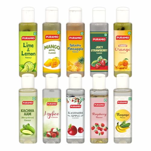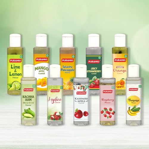 PURAMIO Concentrated Fruit Flavours 30ml Each (Pack of 10)- Lime & Lemon Mango Magic Splashy Pineapple Juicy Strawberry Tangy Orange Kachha Aam Lychee Apple Raspberry Banana