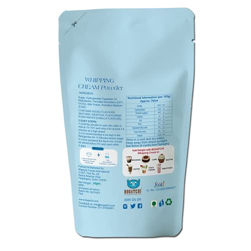 BOGATCHI whipping cream powder is perfect blend of hydrogenated fat and apt amount of sugar to make tasty and delicious cream. This product comes with Free Whipping Cream Powder(50g) & Free Colorful Stars (20g). Simple to use - just add to cold and stir fast with spoon. Your yummy and delicious whipped cream is ready. Decorate your cake tart cookies muffins coffee drinking chocolate etc. The BOGATCHI whipping cream powder is non GMO and gluten free.