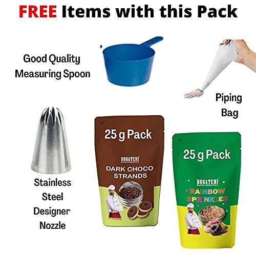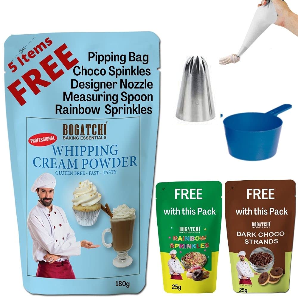 BOGATCHI Whipping Cream Powder for Cake Decoration 180g- Free Choco Sprinkles and Rainbow Sprinkles Nozzle and Piping Bag with Spoon