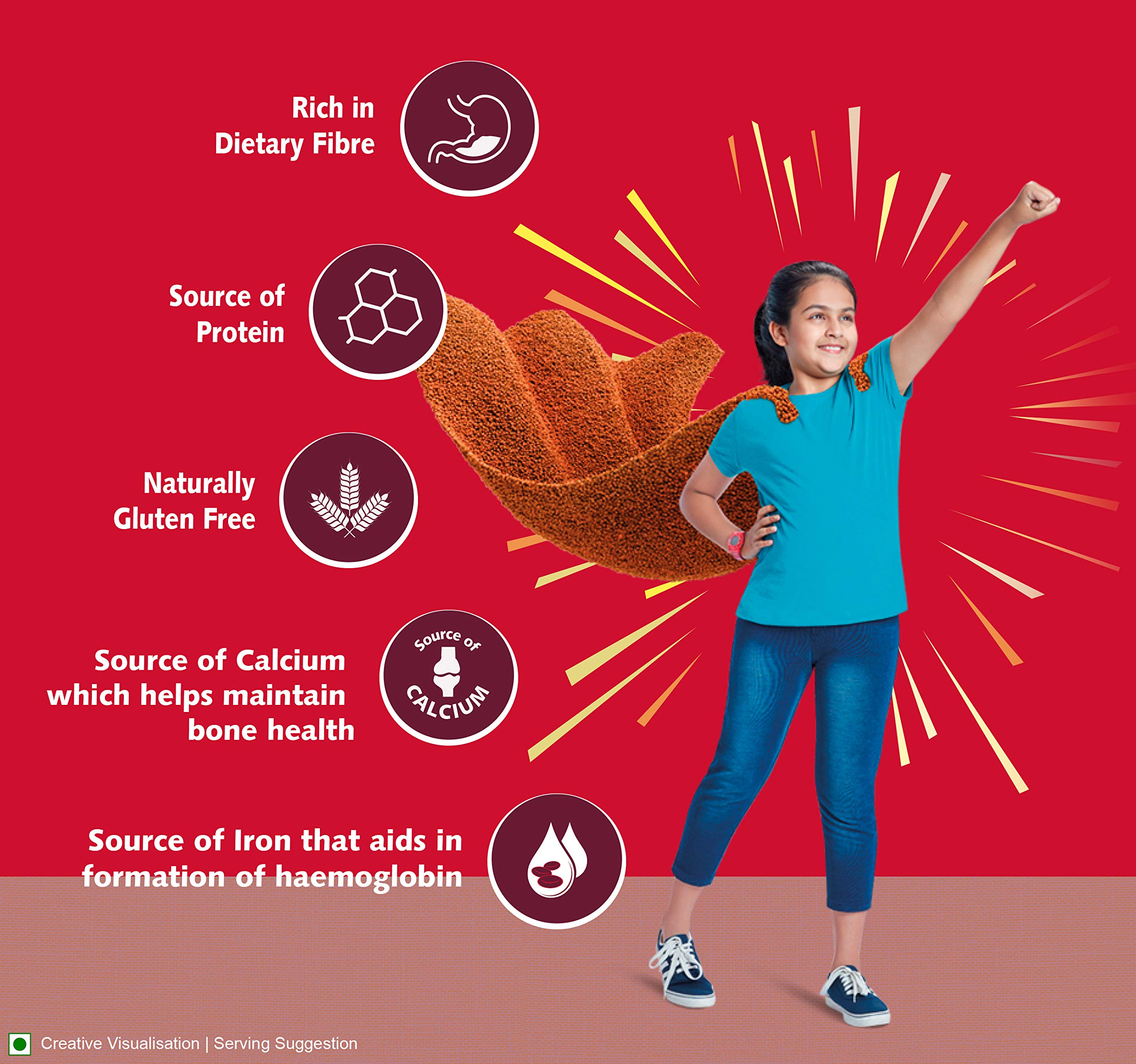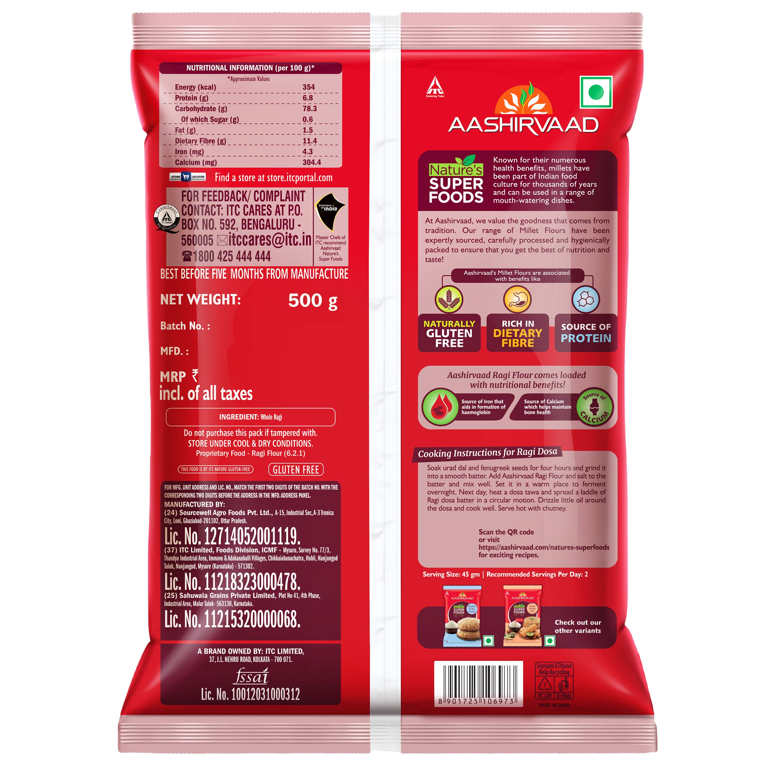 Aashirvaad ensures that only superior quality products reach your kitchen and Aashirvaad Natures Superfoods Ragi Flour stays true to that word. Expertly sourced carefully processed and hygienically packed this flour ensures that you get the best of nutrition and taste. It is also naturally gluten free so people with gluten intolerance can now enjoy their favourite dishes without wear.Known for their numerous benefits millets have been part of Indian food culture for thousands of years and can be used in a range of mouth-watering dishes.Aashirvaad Ragi Flour is not only tasty but also loaded with nutritional benefits. It is rich in dietary fibre which aids in digestion. This flour is also a source of protein. The flour is a source of calcium which helps in maintaining bone health. It is also a source of iron which aids in formation of haemoglobin.Rich in flavour and nutrition Aashirvaad Natures Superfoods ensures the best of both worlds.