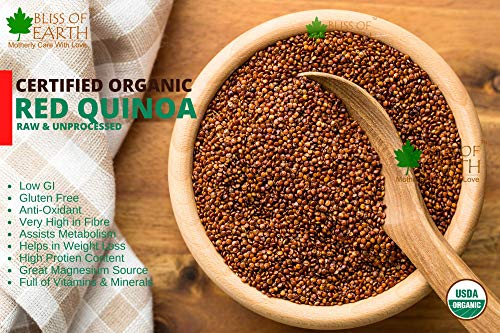 Bliss of Earth Certified Organic Red Quinoa is one of the most popular health food. Its high in protein fiber magnesium B vitamins iron potassium calcium phosphorus vitamin E and various beneficial antioxidants. Its also one of the few plant foods that contain sufficient amount of all nine essential amino acids.