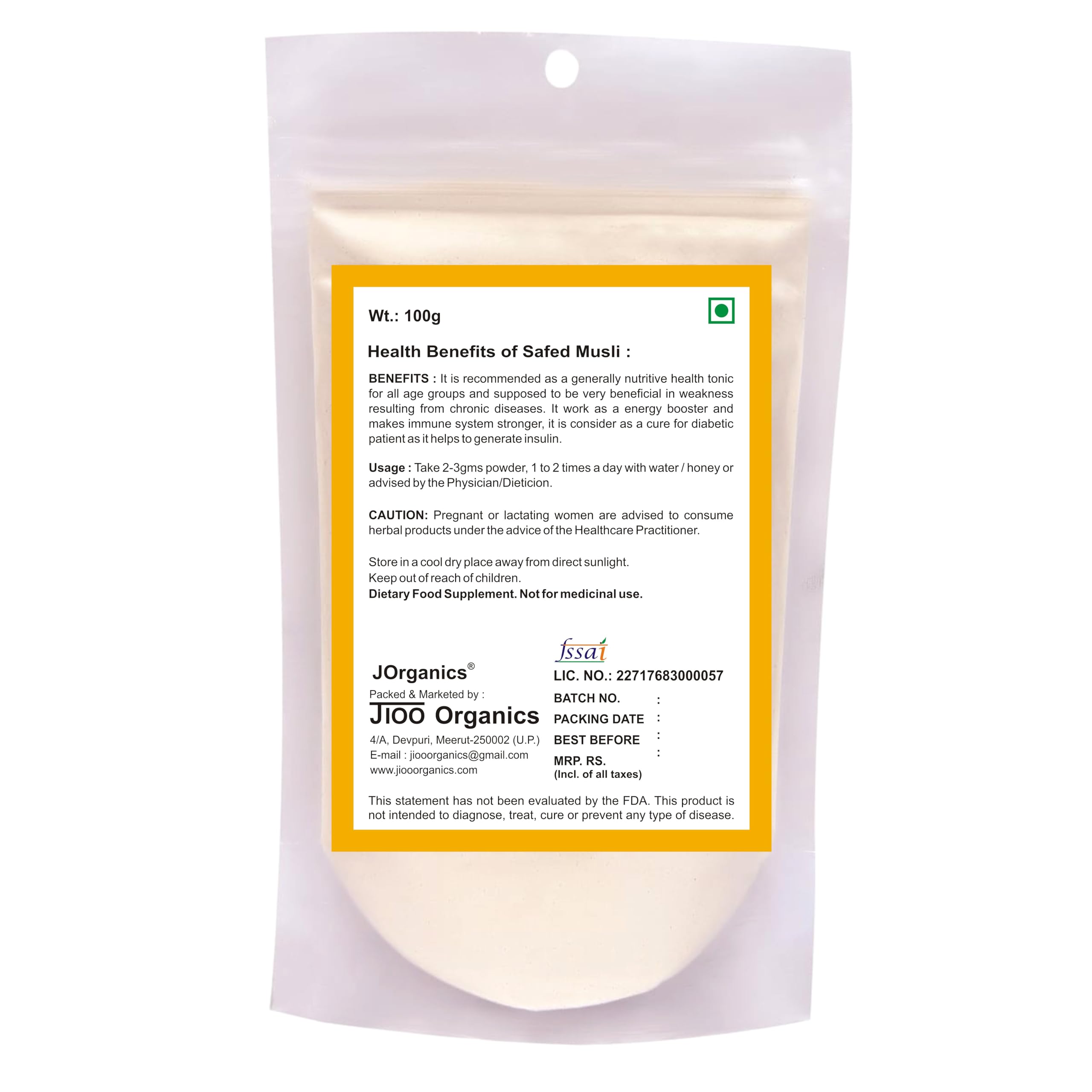 Safed musli is considered as a vitalizer and health tonic. It is a rich source of alkaloids and may help nourish each and every tissue of the body. It is also said to have galactagogue properties.The many medicinal properties of Safed Musli Powder may help to improve vitality vigor stamina & strengthSafed Musli (White Musli) Roots contain 25 types of alkaloids vitamins and minerals like Calcium Potassium and Magnesium.It is a strong adaptogenic herb used in ayurveda and herbal science. Storage: Store in a cool and dry place away from direct sunlight.*24x7 service available