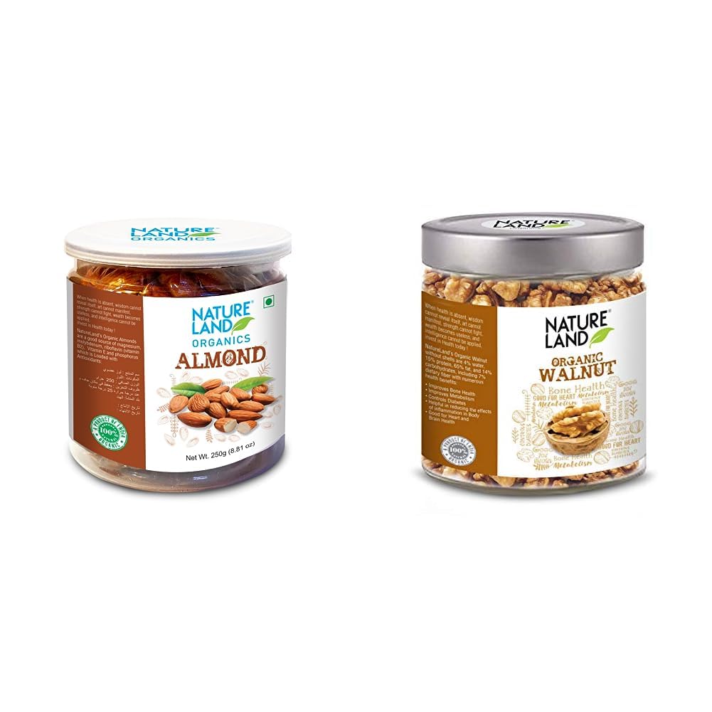 Natureland Organics Almonds 250 Gm Healthy Organic Dry FruitsNatureland's Organic almonds. The health benefits of almonds include lower blood sugar levels reduced blood pressure and lower cholesterol levels. They can also reduce hunger and promote weight loss. It also helps in maintenance of healthy hair skin care (psoriasis) and dental care since it is a rich source of vitamin E calcium phosphorous iron and magnesium. It also contains zinc selenium copper and niacin. Natureland's organic almonds trace back their origin from the hills of Jammu and Kashmir and valley of himanchal Pradesh these almonds sourced from the organic grown selected trees after three years of planting the trees and green almonds are de shelled to give you the best quality of non pasteurized shelled almonds. Best organic grocery and gourmet.Natureland Organics Walnuts (Akhrot) 150 Gm - Without ShellNatureland's organic dry fruits walnuts trace back their origin from snowy hills of Jammu and Kashmir; these walnuts are nutrient dense with protein and essential fatty acids. Walnuts are available in two forms; in their shells or shelled. Raw walnuts contain antioxidants. They also contain triglycerides of the n-3 fatty acid alpha-linolenic acid which is effective in reducing heart risk. Walnuts are known to be very helpful in fighting heart problems diabetes weight control improved reproductive health in men and good for brain. Best organic walnut.