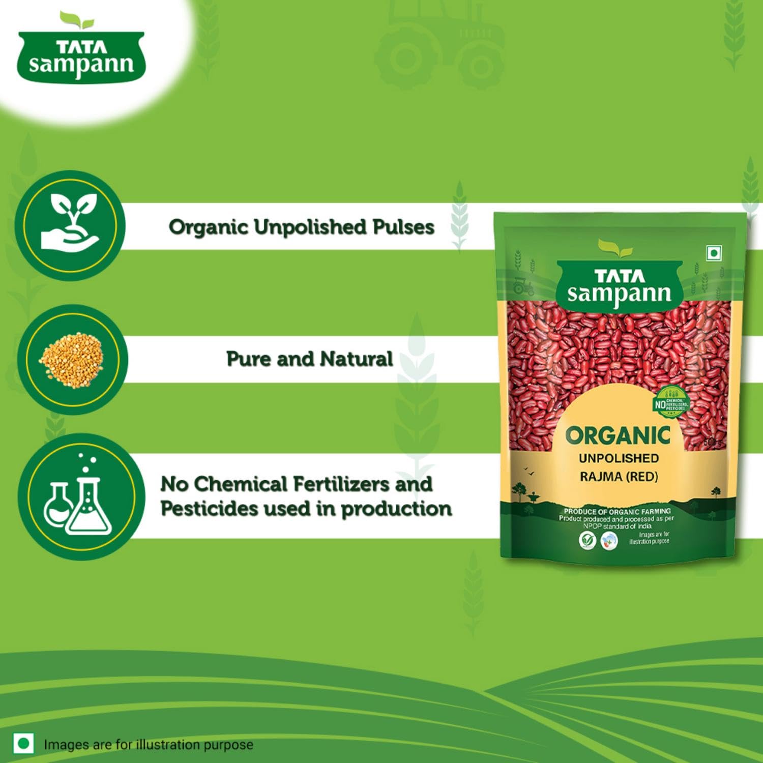 ORGANIC: Tata Sampann Organic Pulses are sourced from certified organic farms where no chemical fertilizers or pesticides are used. PRODUCE OF ORGANIC FARMING : Tata Sampann Organic Pulses are produced and processed as per NPOP standard of India and USDA NOP UNPOLISHED: It does not undergo any artificial polishing with water oil or leather thereby retaining its goodness and wholesomeness. STRINGENT QUALITY CHECK: Ensures that the grains of dal are uniform in size and colour. So whenever you are in the mood to cook something easy and delicious dive into the scrumptious taste of Tata Sampann pulses and enjoy a delicious meal! Explore Tata Sampann Organic Pulses range Toor Dal Masoor Dal Chana Dal Urad Whole Chana Dal Moong Dal Urad Dal Moong Dal Rajma (Red) Brown Chana Moong Chilka and Kabuli Chana.