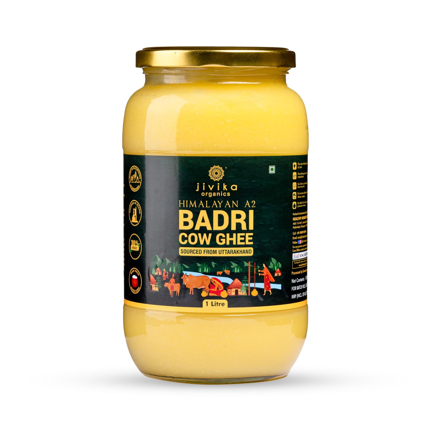 JIVIKA Premium A2 Badri Cow Ghee 1Litre | Vedic Bilona Ghee from Uttarakhand | Hand Churned from Whole Curds | A2 Milk from Grass Fed Badri Cow | Pure and Authentic | Glass Bottle
