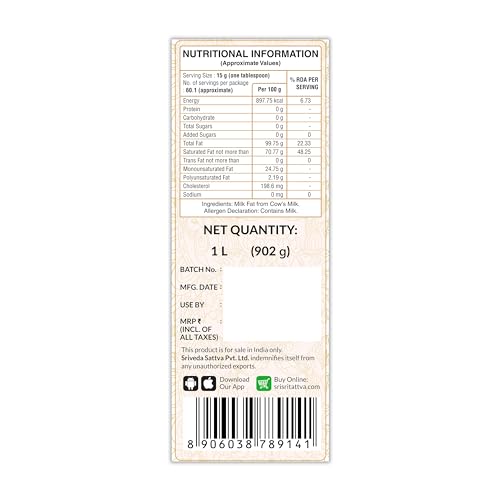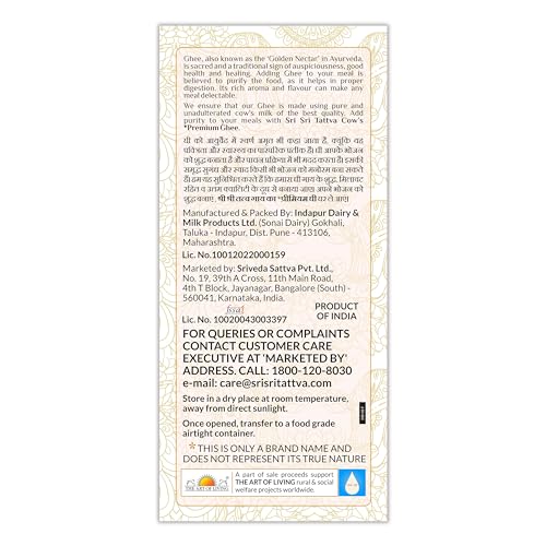 Ghee is sacred and a traditional sign of auspiciousness good health and healing. A spoonful of ghee has always been considered to add richness and purity to the entire meal. Rich in aroma and texture ghee kindles the digestive fire in the body contributing to better nutrition. Sri Sri Tattva Premium Ghee is made using high quality cow's milk in the most hygienic and safe conditions to ensure its purity and quality. Add delicacy to your life with Sri Sri Tattva Premium Ghee.