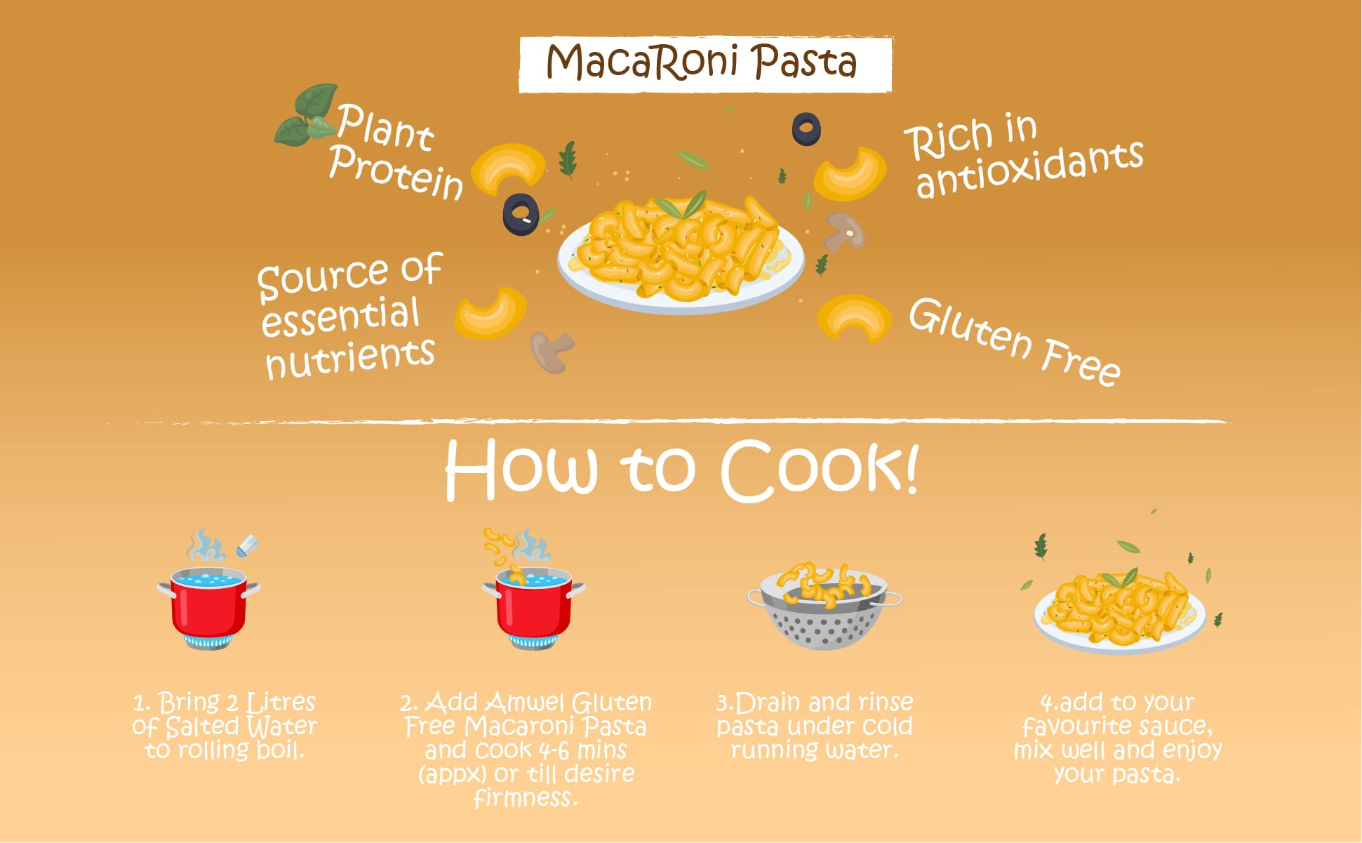 • EASY TO COOK : Amwal Rice Macaroni is as easy to cook as normal pasta. Cooking time required is 6 mins to boil. your favourate pasta sauce in the Rice Macaroni as per your taste.