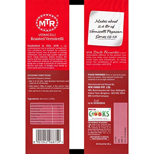 Enjoy a tasty and hearty meal with MTR Roasted Vermicelli. Made from semolina it is non-sticky and does not form lump. This variety of vermicelli comes pre-roasted for a crispier taste and has mild aroma in it. Simply cook and savour its delicious goodness.