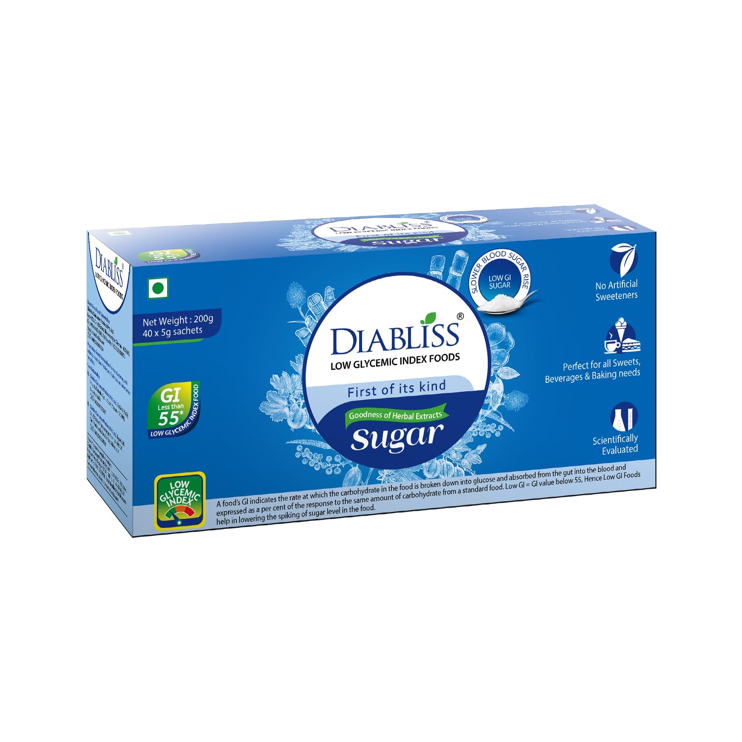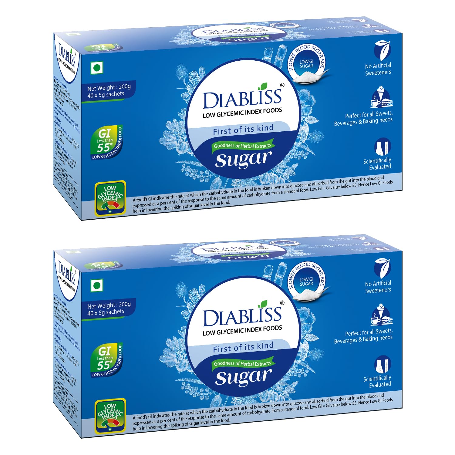 DiaBliss Herbal Cane Sugar with Low Glycemic Index (GI) - 40 x 5 Grams Sachet Box - Pack of 2