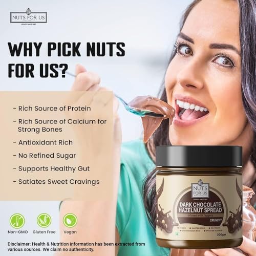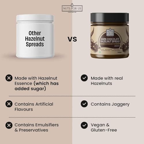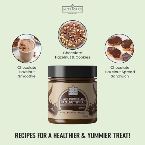 Nuts for Us Dark Chocolate Hazelnut Spread Butter a delightful blend designed for chocolate lovers of all ages! Our premium 200g spread combines the irresistible crunch of hazelnuts with luscious dark chocolate infused with the natural sweetness of jaggery for a healthier twist. Perfect for spreading on toast drizzling over pancakes or simply enjoying by the spoonful this nutritious treat contains no added preservatives or refined sugars. Experience the joy of a guilt-free indulgence that satisfies your sweet cravings while providing essential nutrients. Treat yourself and your family to a delightful taste sensation with every jar!
