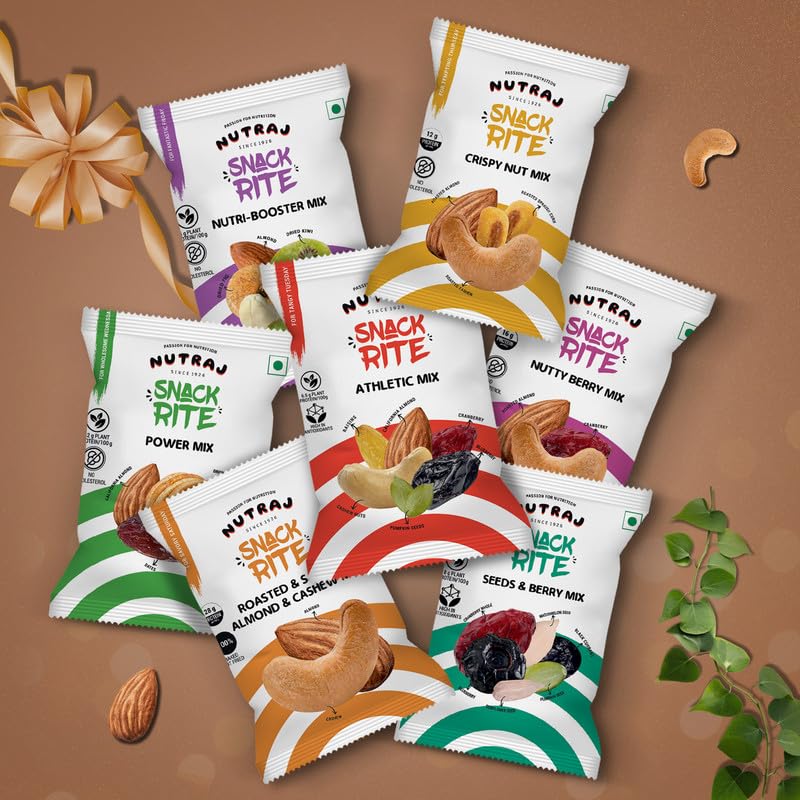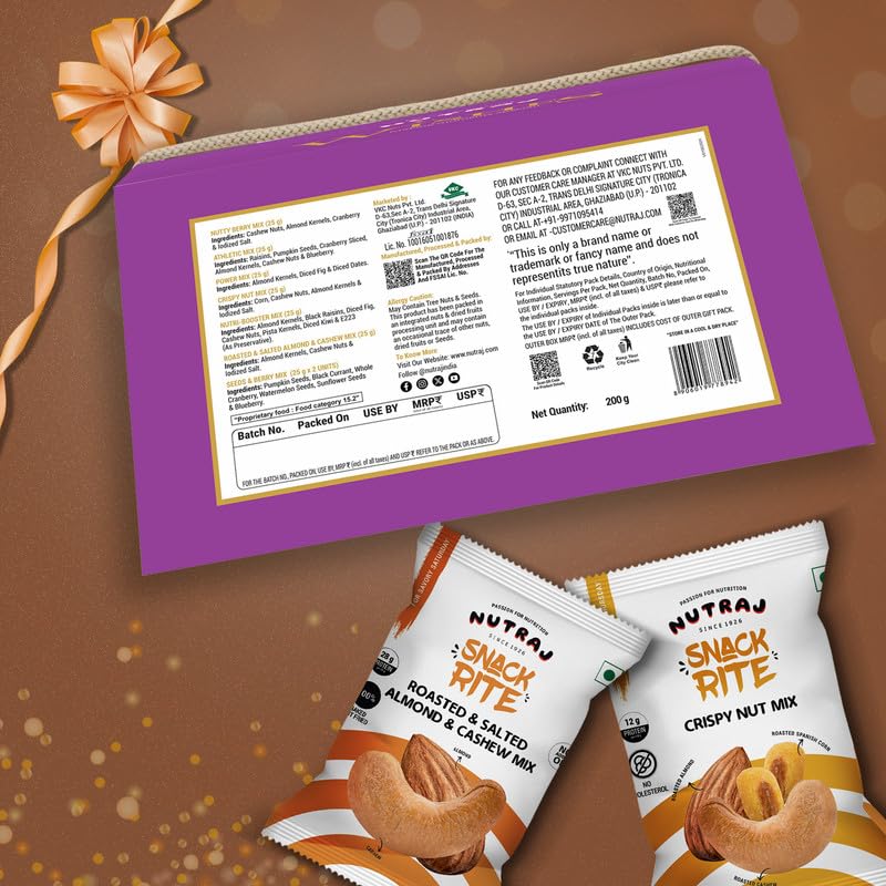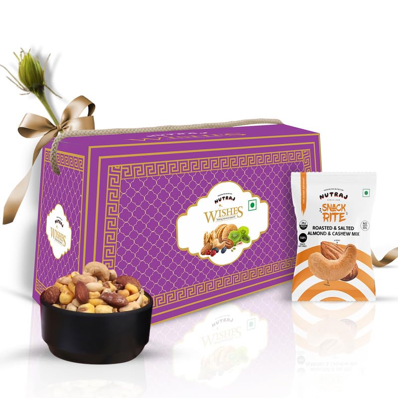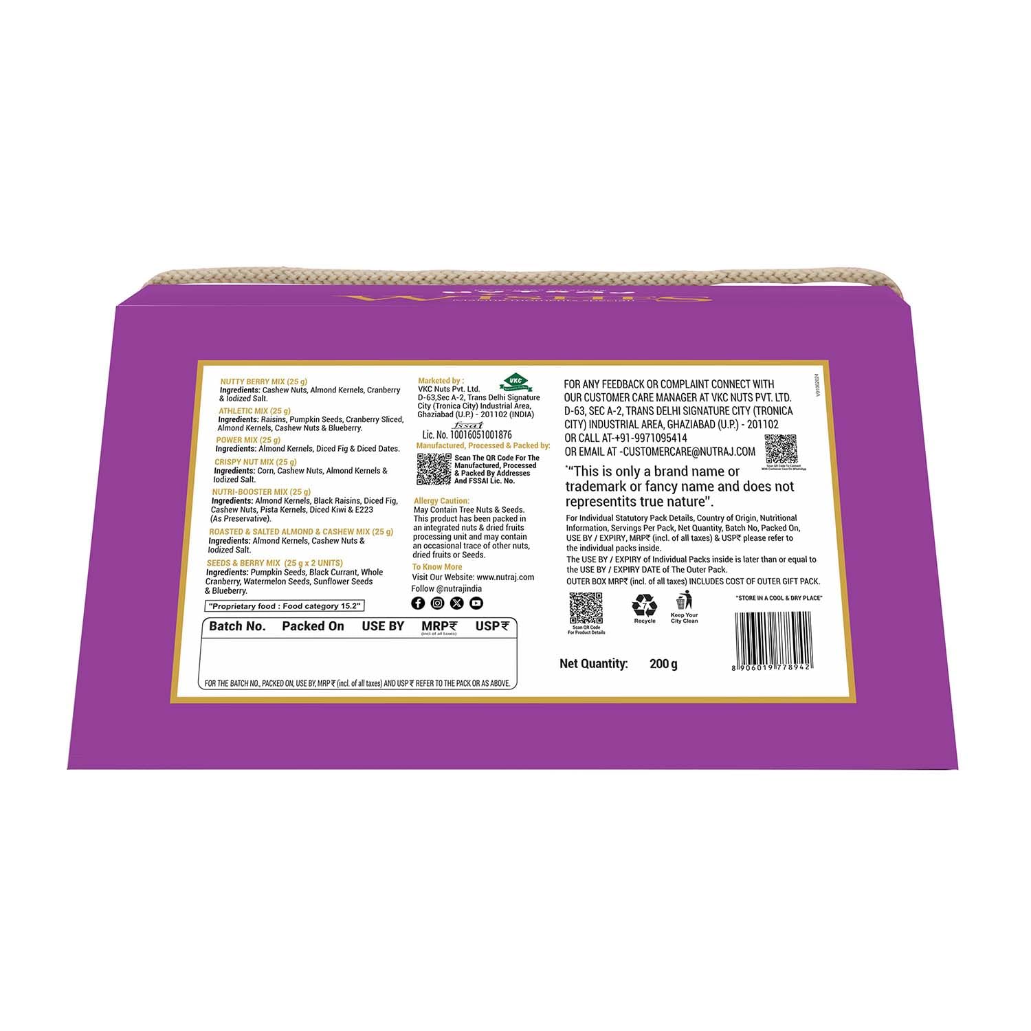 Celebrate this Diwali by surprising your loved ones with a gift that embodies the festive spirit and shows how much you care. The Nutraj Wishes Healthy Mix Diwali Gift Box is the ultimate way to elevate your Diwali gifting. Thoughtfully curated with love and care this gift box is the perfect choice to share with those you cherish making their Diwali even more special. What's Inside? 1. Nutty Berry Mix25g 2. Athletic Mix25g 3. Power Mix25g 4. Crispy Nut Mix25g 5. Nutri- Booster Mix25g 6. Roasted & Salted Almond & Cashew Mix25g 7. 2 pouches of Seeds & Berry Mix 25gThis gift box features the finest selection of nutrient-rich trail mix pouches carefully chosen to support your loved ones' health while delighting their taste buds. It's a 100% tasty healthy and nutritious way to keep them.
