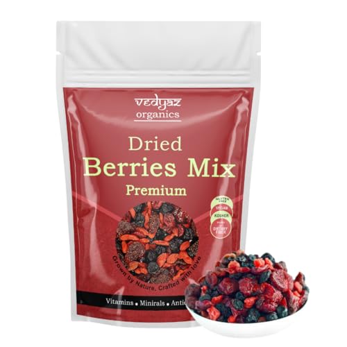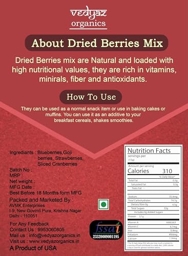 Vedyaz Organics Berries Mix Contains 4 Naturally Dehydrated Berries (Blueberry Goji Berries Strawberry & Sliced Cranberries) which are rich in Vitamin K C and antioxidants and have a good amount of fiber. This Berry Mix can be added to your Oatmeal Salads. Also you can you them while baking and making shakes or smoothies.