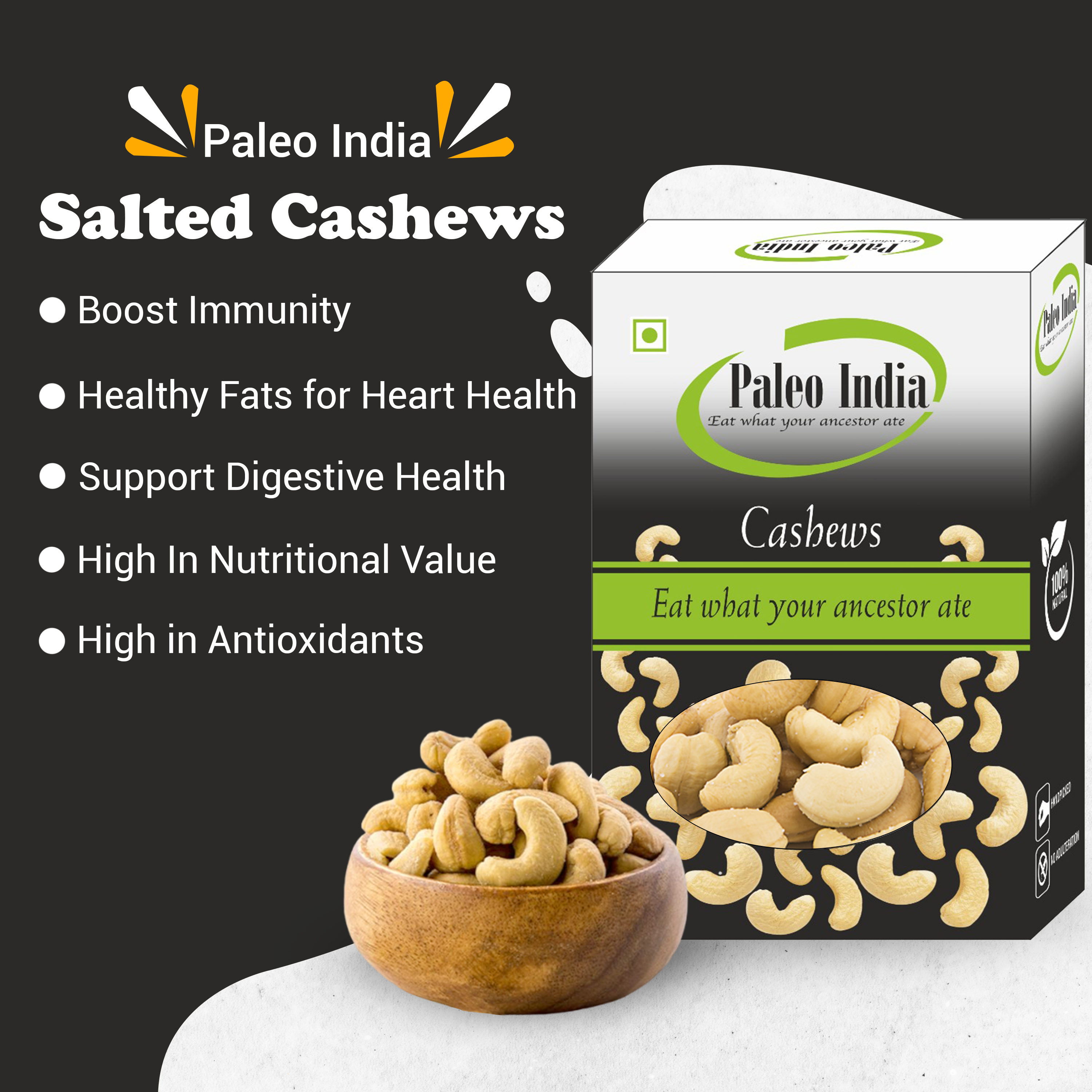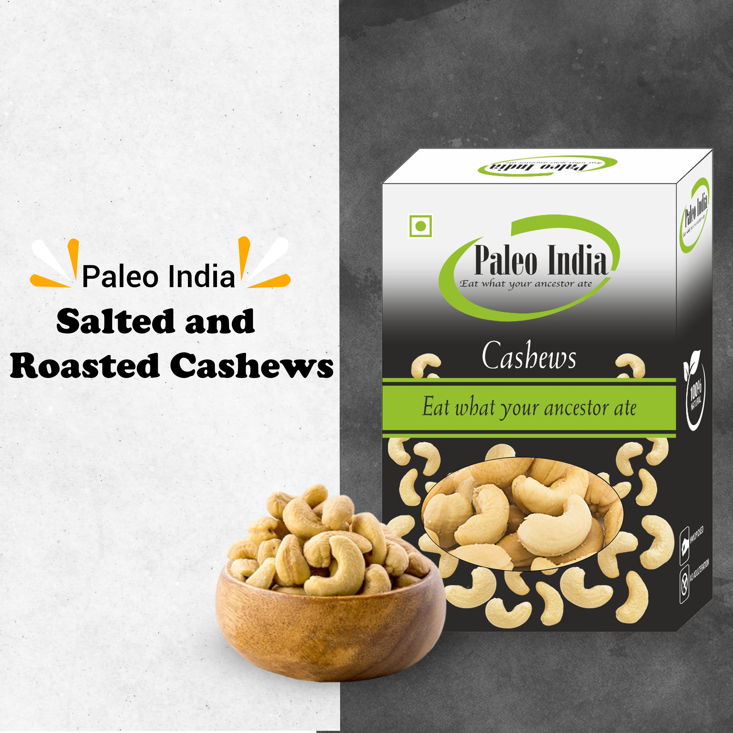 Paleo India Roasted and Salted Cashews are great snack that is healthy and also full of flavor. Roasted and Salted Cashews are rich in fiber, protein, and healthy fats. They are also contain variety of vitamins, minerals, and health-protective beneficial plant compounds. Similarly to nuts, cashews may promote weight loss, blood sugar control, and heart health. Enjoy 100% fresh Roasted and Salted Cashews that are crunchy, flavourful, and of uniform colour and deluxe size. As a consumer, you seek freshness, nutrition, and quality in everything you buy. Premium packaging keeps goodness and quality intact ensuring crunch and great flavour. Buy Paleo India Roasted and Salted Cashews and other products in the range to bring happiness to your loved ones and yourself! Buy Paleo India Roasted and Salted Cashews online.