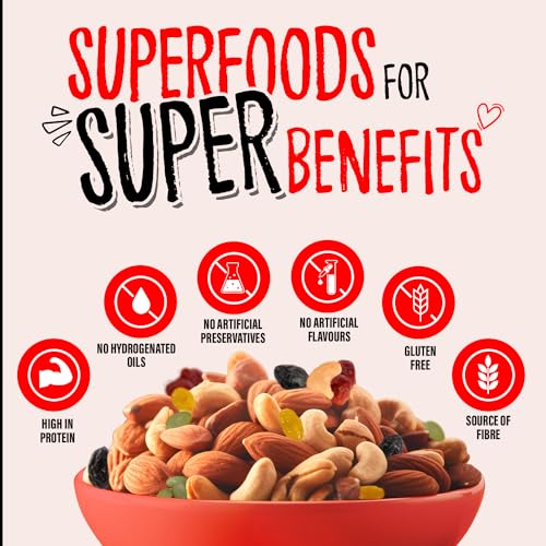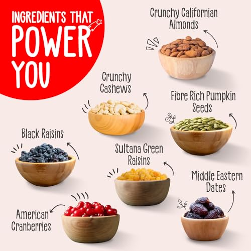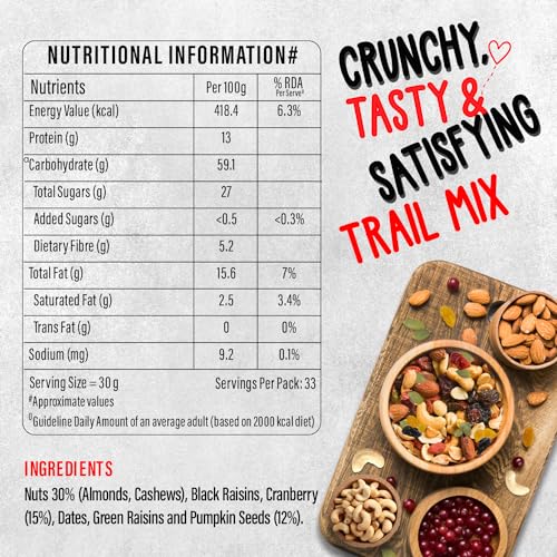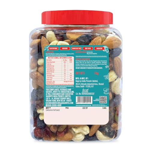 HomeGroceryNutsMixed Dried FruitsBagrrys Trail Mix 1 Kg, Superfood Health Delight| Premium Nuts, Seeds & Berries Mix – California Almonds, Cashews, Black Raisins, American Cranberries, Midde Eastern Dates, Pumpkin Seeds, Green Raisins| Healthy Anytime Snack, High in Protein, Source of Fi
