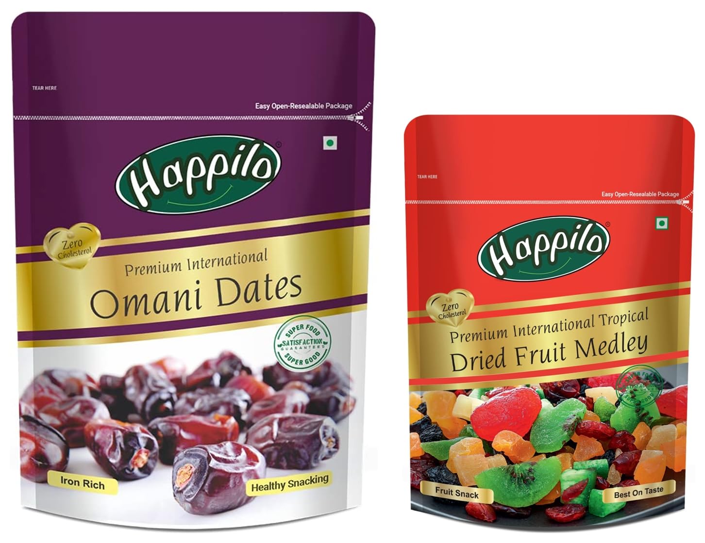 Happilo Premium International Dried Tropical Fruit Medley 200 g | Wholesome & Vitamin Rich Healthy Snack | No Artificial Colors Gluten Free No PreservativesHappilo brings to you the world of premium snacking nuts dry fruits Dried fruits Berries Seeds mixed nuts fusions nut mix and more A Brand that is committed to improving the quality of your life Happilo provides food that is packed with the goodness of nature and taste that will keep you wanting for more. With a range of food items across categories like Dry fruits Nuts Seeds Berries Nut Mixes and other healthy items each of our products is not only 100% Natural but is also made of 100% Whole Grains. While we stand strongly for Health wherein our products have a clear functional benefit we believe that Taste is the most important element when it comes to Snacks. We strive to bring the best range of snacks to you. Healthy Snacking with Happilo Premium Dry Fruits Nuts Seeds Berries & Nut mixes.Happilo Premium International Omani Dates 250g Khajoor/Khajur Healthy & Nutritious Snack Rich in Vitamins & Minerals Natural SweetenerHappilo has travelled the world to get the finest gourmet dry fruits. They are one of the most nutritious dried fruits in the world they're a yummy healthy snack. Great for Snacking adding to Cereal Cooking and Baking. High Antioxidants Dietary Fiber No Gluten Non GMO Zero Trans Fat & Zero Cholesterol. Daily need products for a healthy and energetic life. Happilo Zip Lock Pouch with airtight seal to ensure the product is protected and fresh. Quality assured - Happilo products are rigorously tested against the industry's best quality standards.