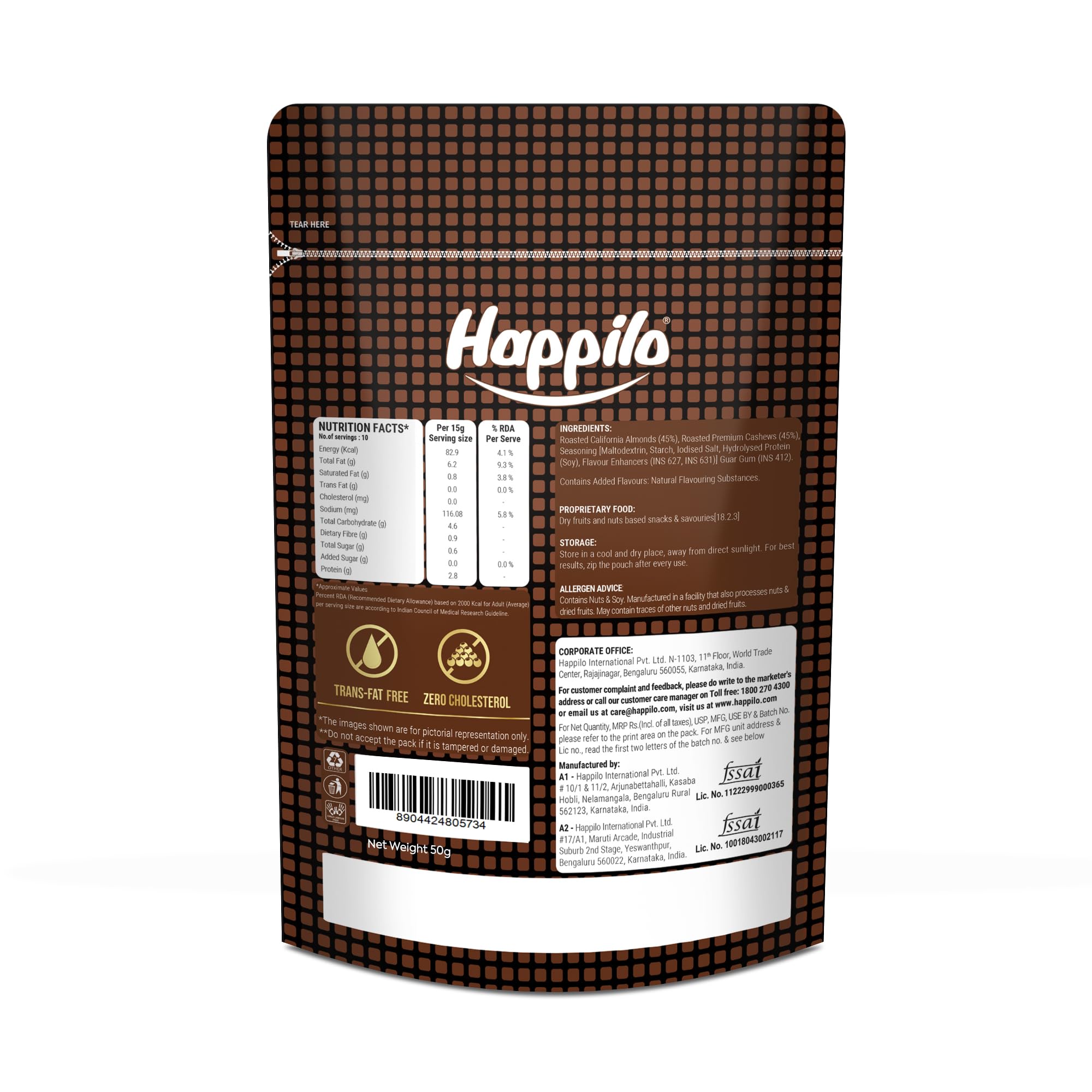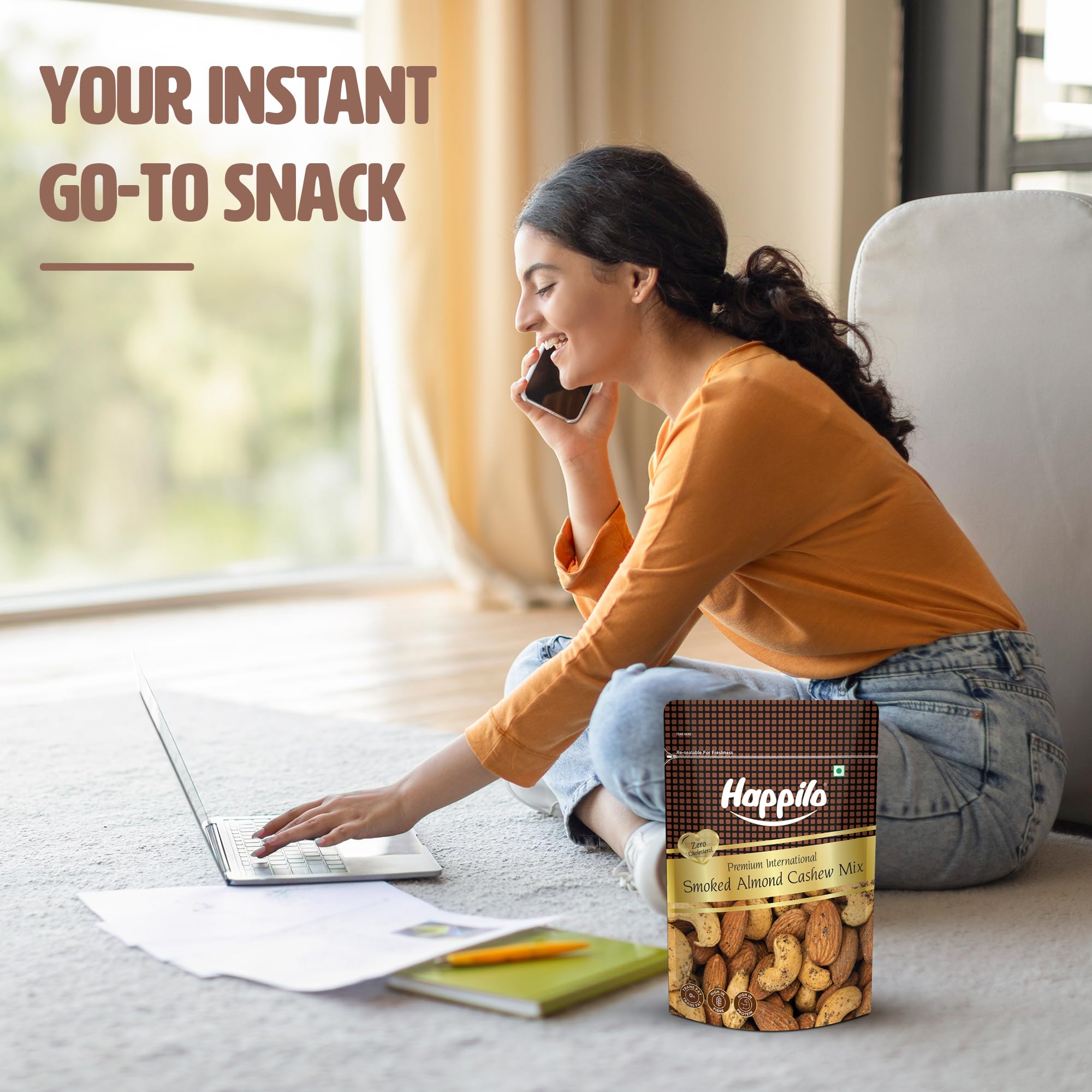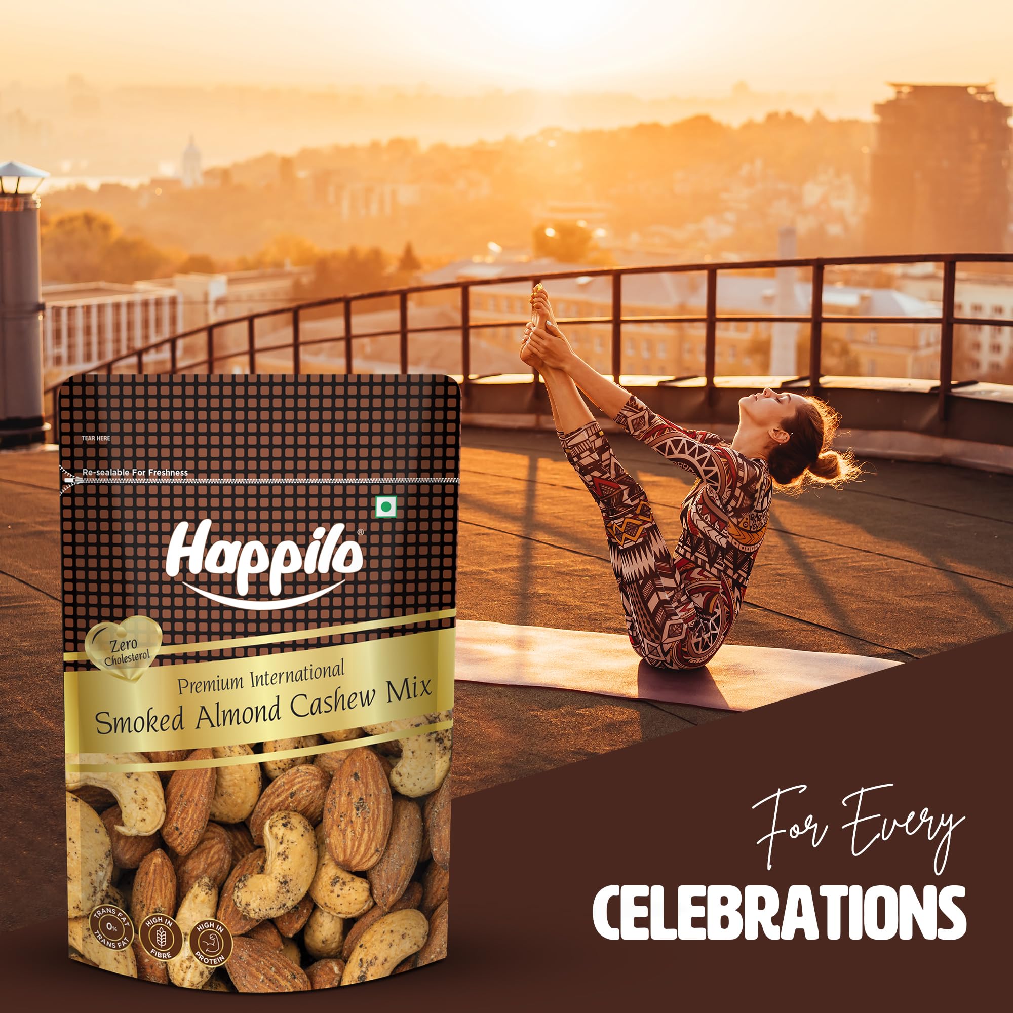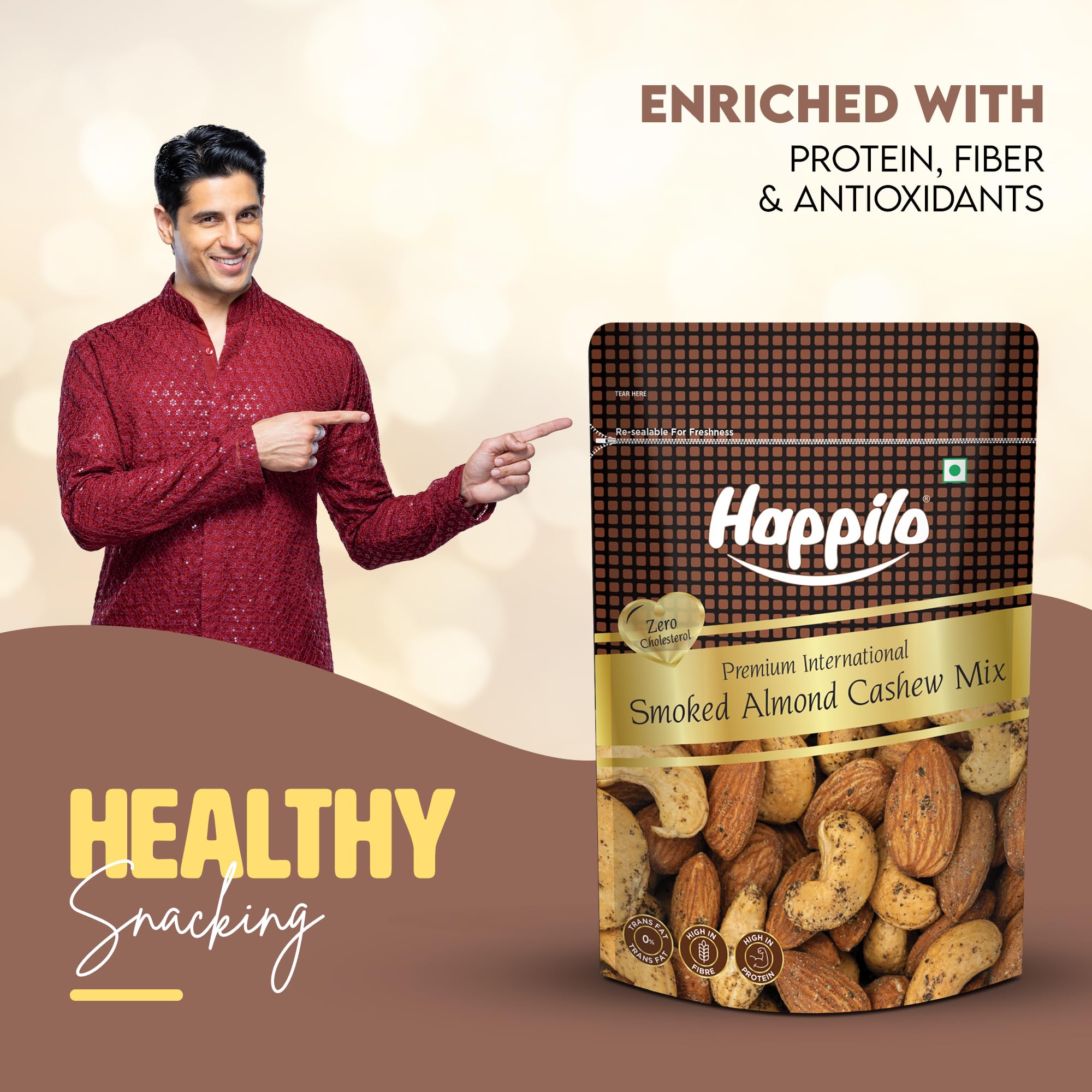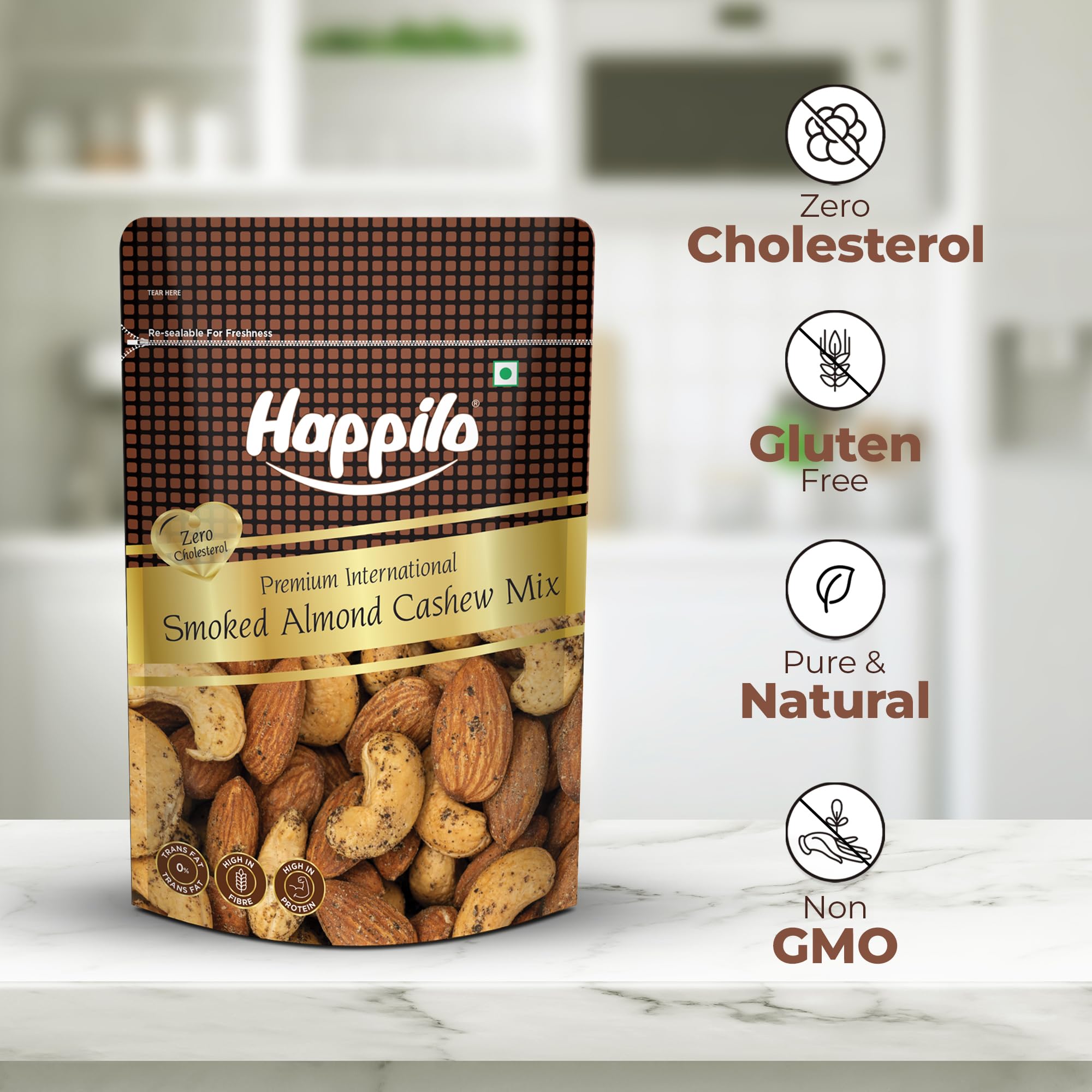 Happilo Premium International Smoked Almond Cashew Mix is a gourmet snack that combines the rich taste of roasted almonds and cashews with a deep smoky flavor. Each nut is carefully selected and roasted to perfection delivering a satisfying crunch and bold flavor in every bite. This mix is free from artificial colors flavors and preservatives ensuring a natural and wholesome snacking experience. Packed with healthy fats protein and essential nutrients it supports heart health and provides long-lasting energy. Whether enjoyed on its own served at social gatherings or used to add flavor and texture to dishes this smoked nut mix offers a perfect blend of taste and nutrition for snack enthusiasts.