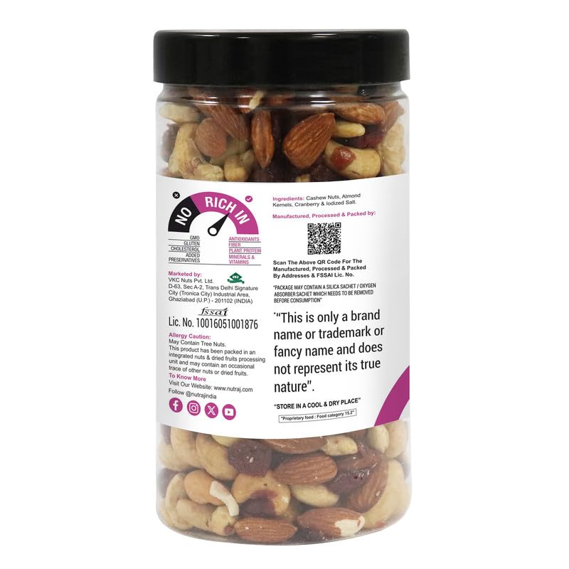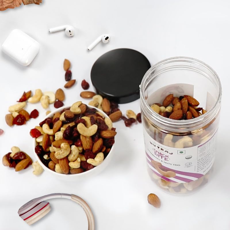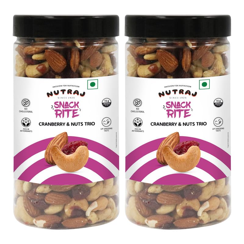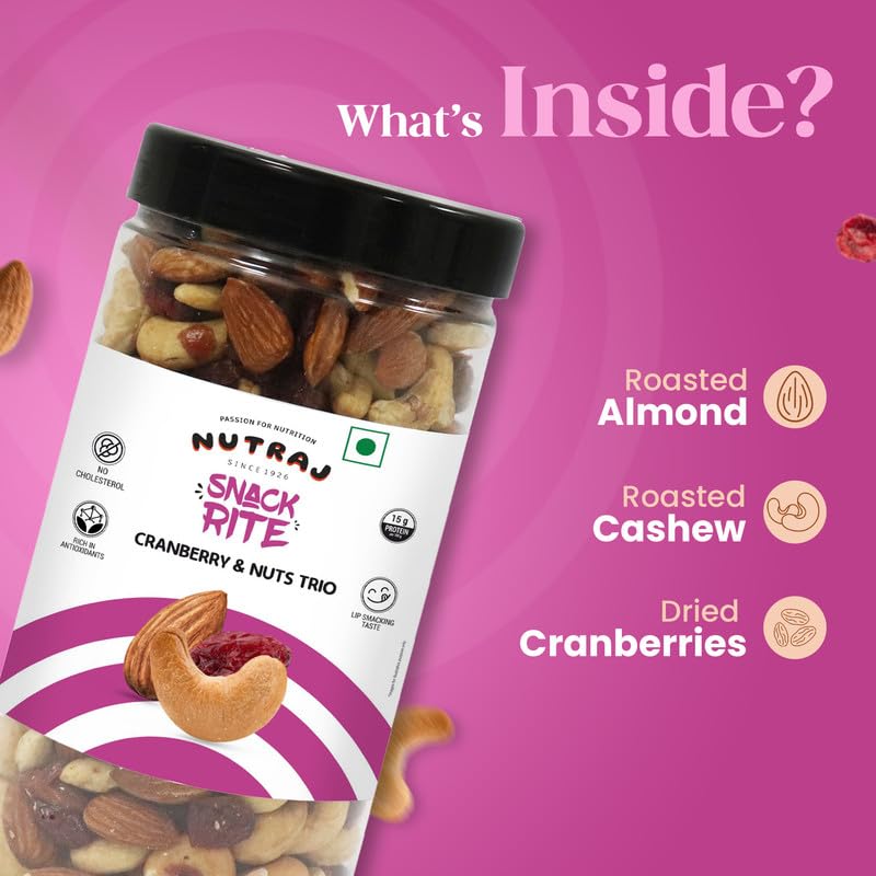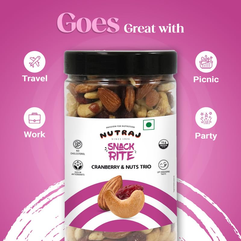 • Nutraj Snackrite Cranberry Trio is a wholesome blend of cashews almonds combined with sliced cranberries. This snack is the perfect partner for curbing hunger allowing you to enjoy snacking without guilt.