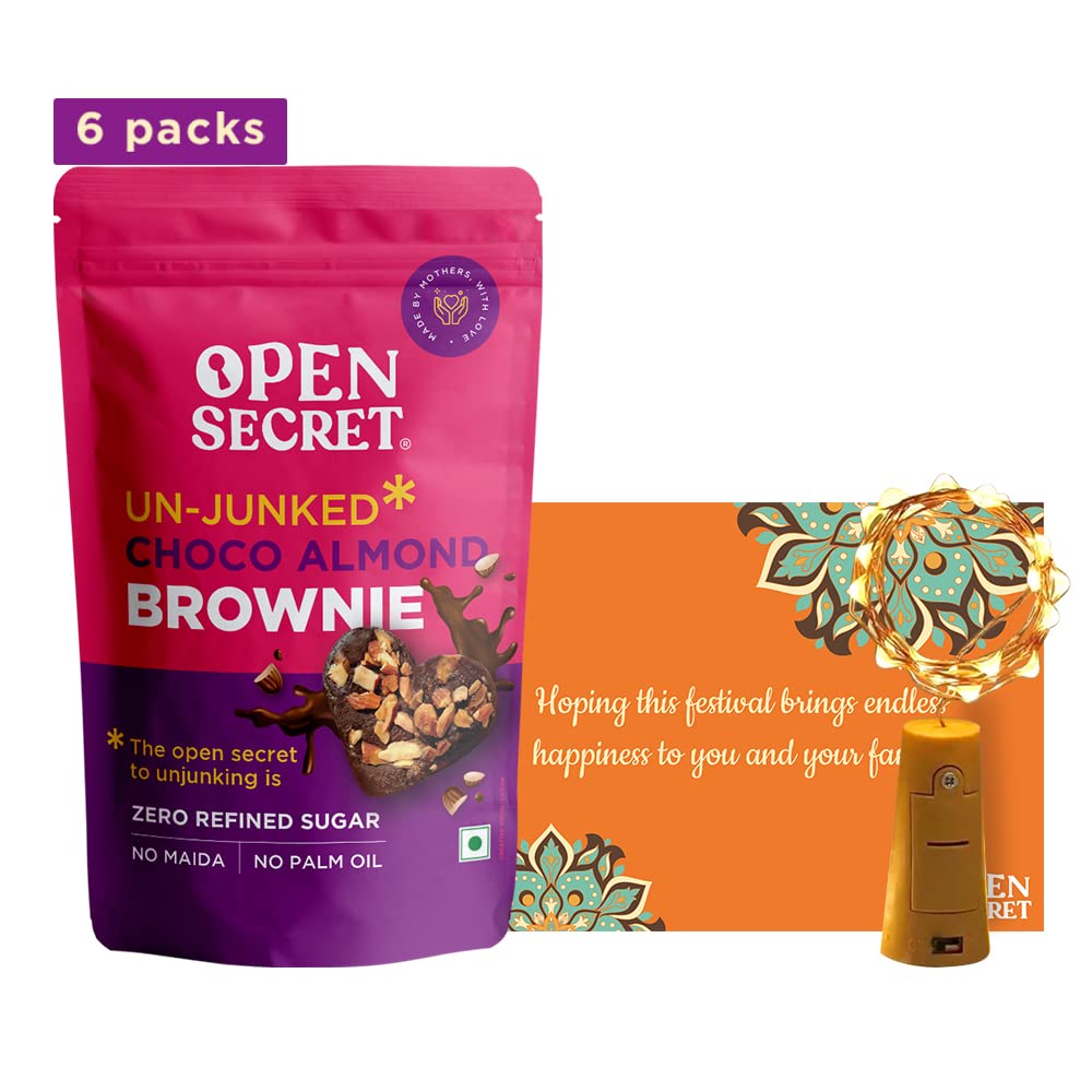 Open Secret Chocolate Almond Brownie (Pack 6), Brownies Gift Hamper | Card, Lights| Zero Refined Sugar No Maida Guilt| Healthy Special Hamper Snacks Combo Box