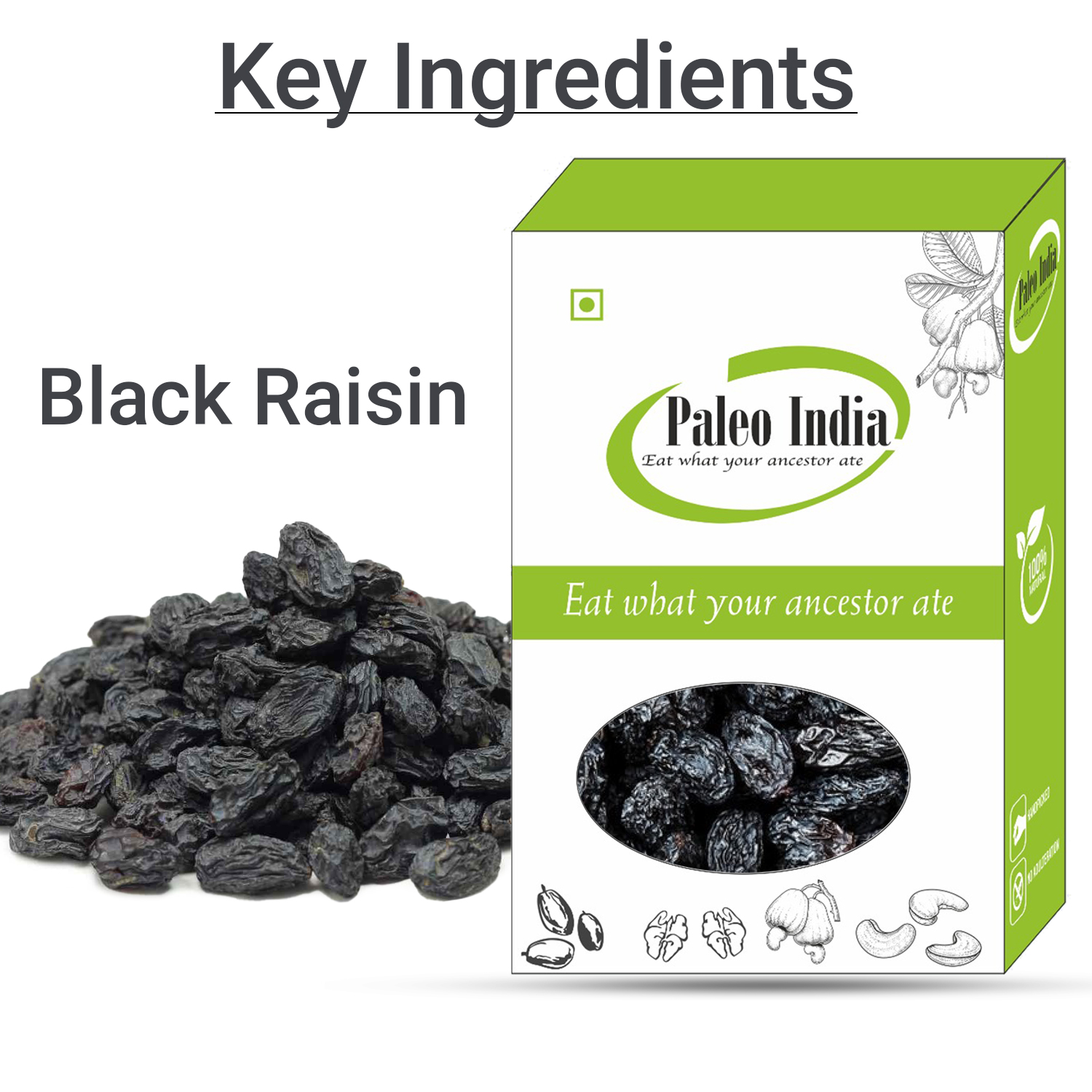 Paleo India offers Black Raisins Pack. Raisins are known by many names, kismis, kishmish, daakh, draksh, raisins. Naturally contains anti oxidants, fiber and potassium. Raisings goes along with all dry fruits not only with Cashews but also with almonds apricots walnuts.Black kishmish contains high anti oxidants, dietary fiber, no gluten.Black Raisins keep blood free from impurities and protect the skin cells. Reduces bad cholesterol in blood and helps regulate Kishmish helps in digestion, reduces acidity and increase immunity. You can Buy online now.