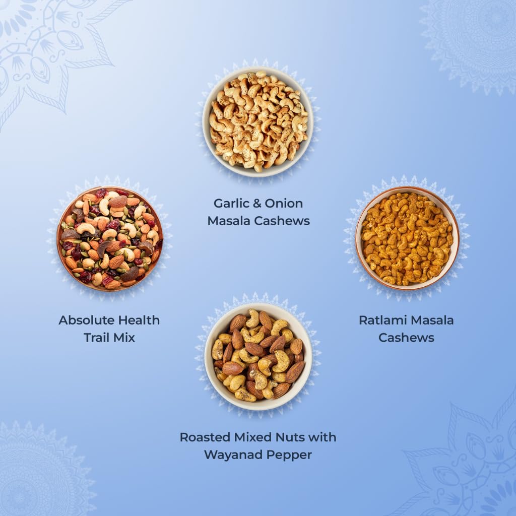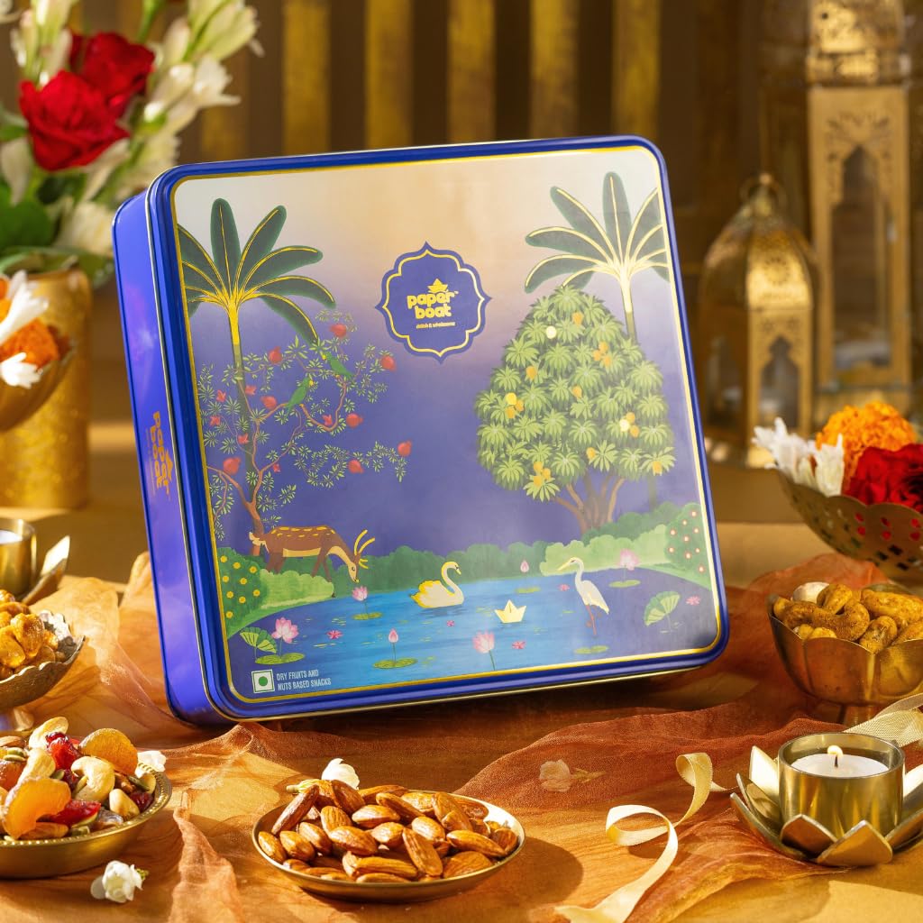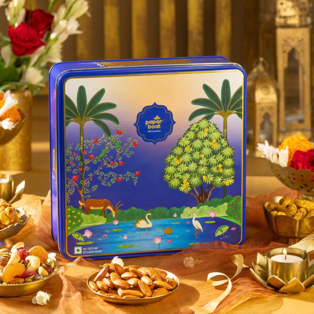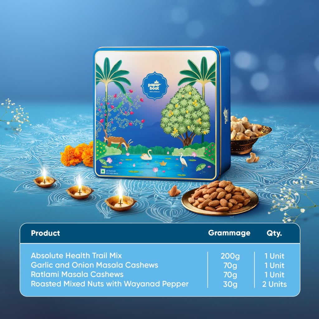 The Midnight Blue Collection Dry Fruits Gift Box by Paper Boat is a luxurious assortment of trail mixes and nut mixes carefully curated to offer a premium snacking experience. With a generous 400g of delectable dry fruits this gift is ideal for any event whether it's a grand celebration a special occasion or just because. The Paper Boat dry fruits hamper features an assortment of mixed nuts creating a harmonious blend of flavors that will tantalize your taste buds and leave you craving more.