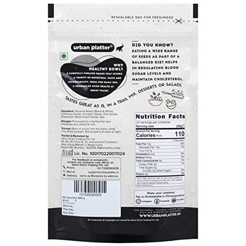 A superseed platter is created with our blend of black white pumpkin sunflower flax watermelon & coriander seeds to meet both your snacky and nutritious needs. All these seeds are individually concentrated in essential nutrients and when brought together they are a powerhouse of essential plant compounds protein fiber antiand omega-3 healthy fats. Roasted seeds have a nutty flavor and extra crunch which makes them a great ition to trail mixes granolas or just to snack on at any time. a handful of this seed mix to your melike salads oatmeal veggies rice and even while baking bread or ! Urban Platters Healthy Bowl Pouches are the most convenient & easiest way to consume your handful of favourite nuts and seeds on a daily basis. Open grab your handful and zip back! The sealable pouch makes sure your dry fruits remain crunchy and fresh at all times. Perfectly sized pouches for your road trips workplace snackable moments schools or as your travel buddy!