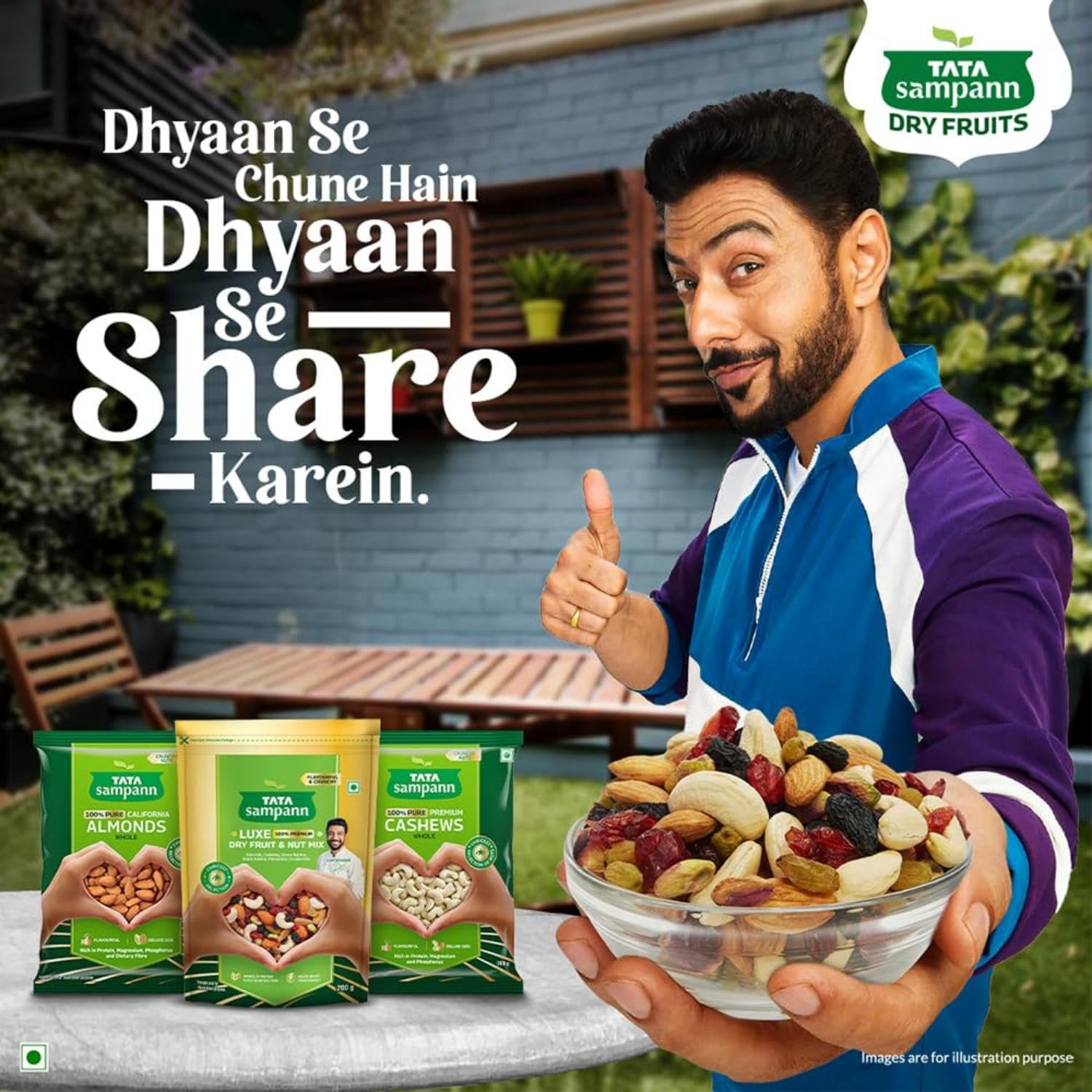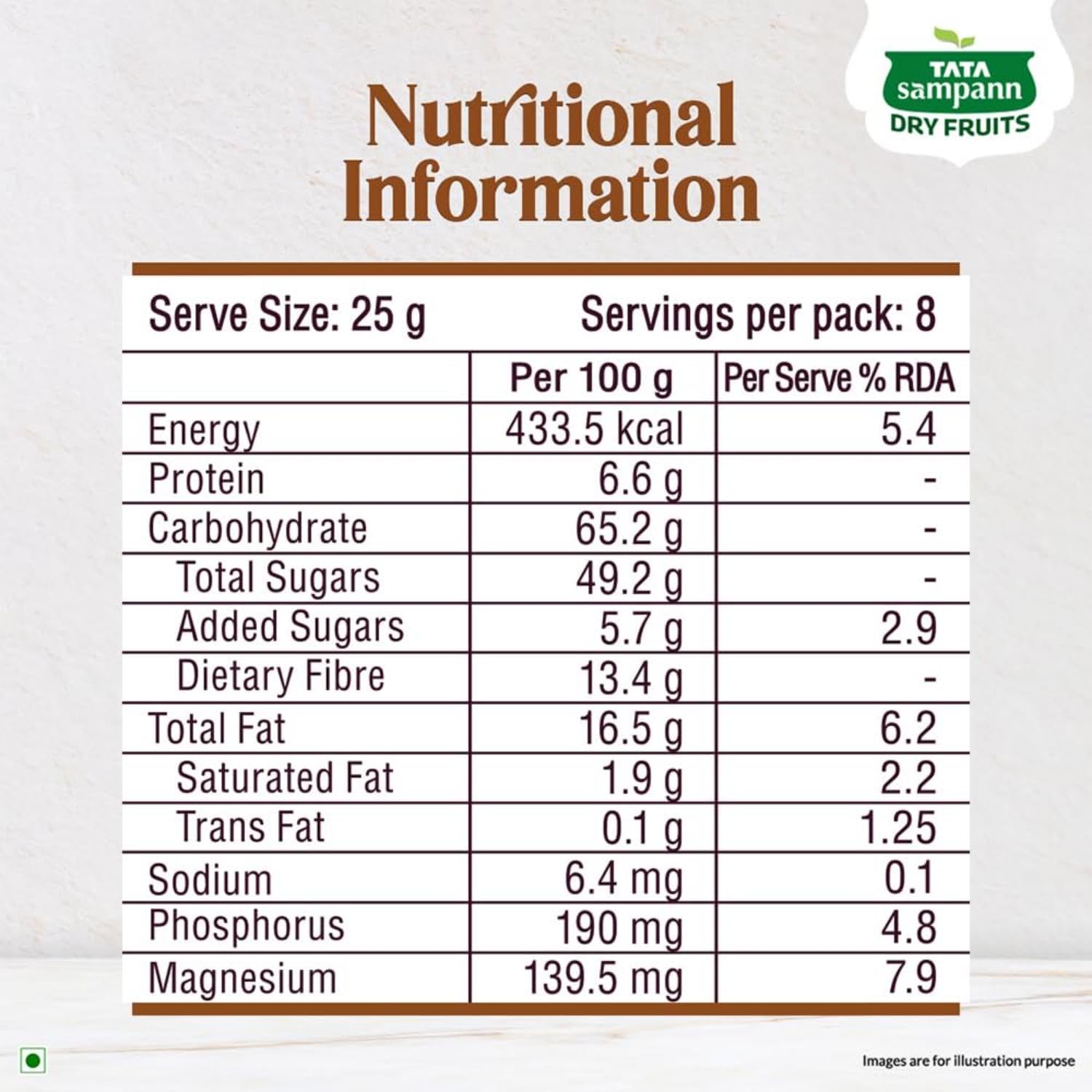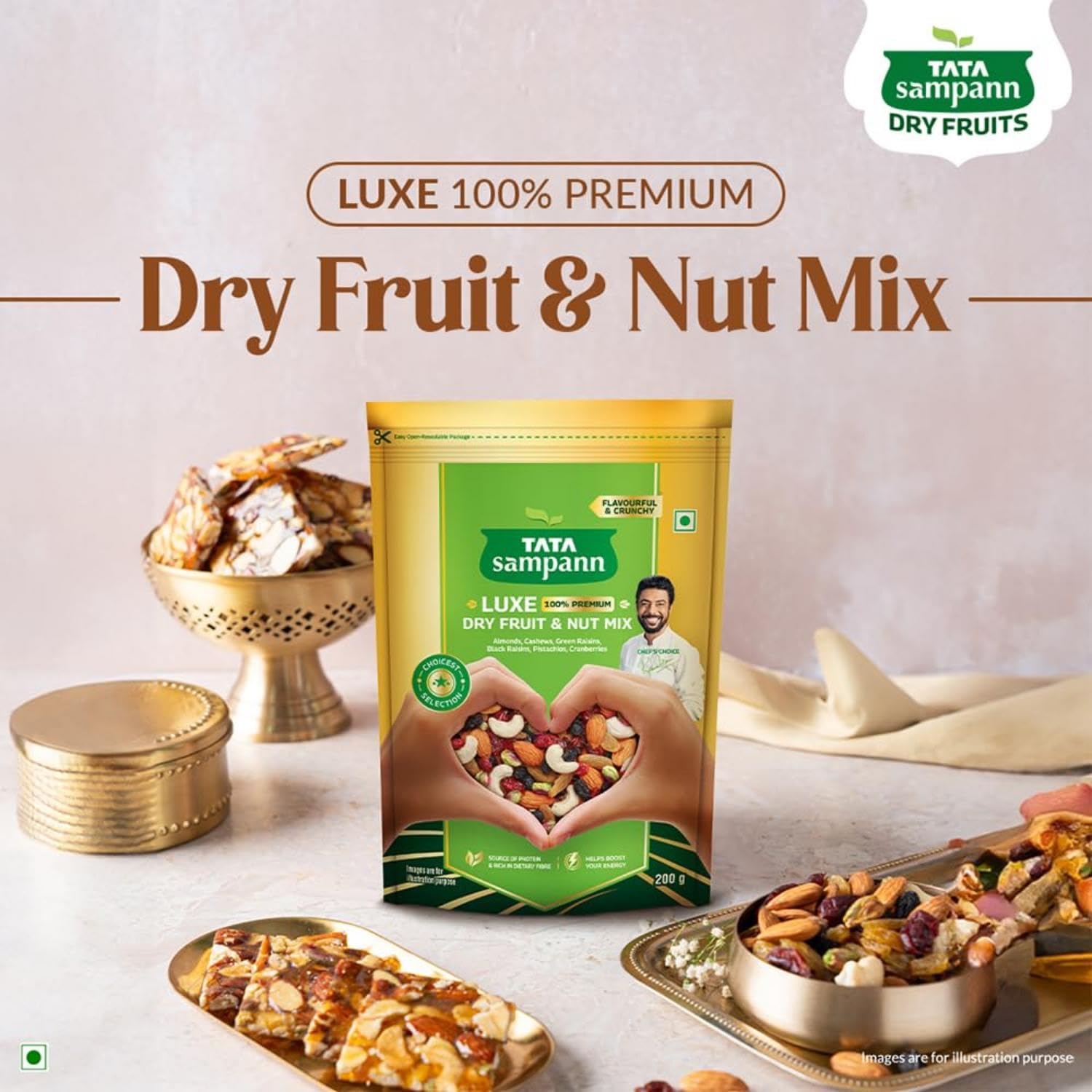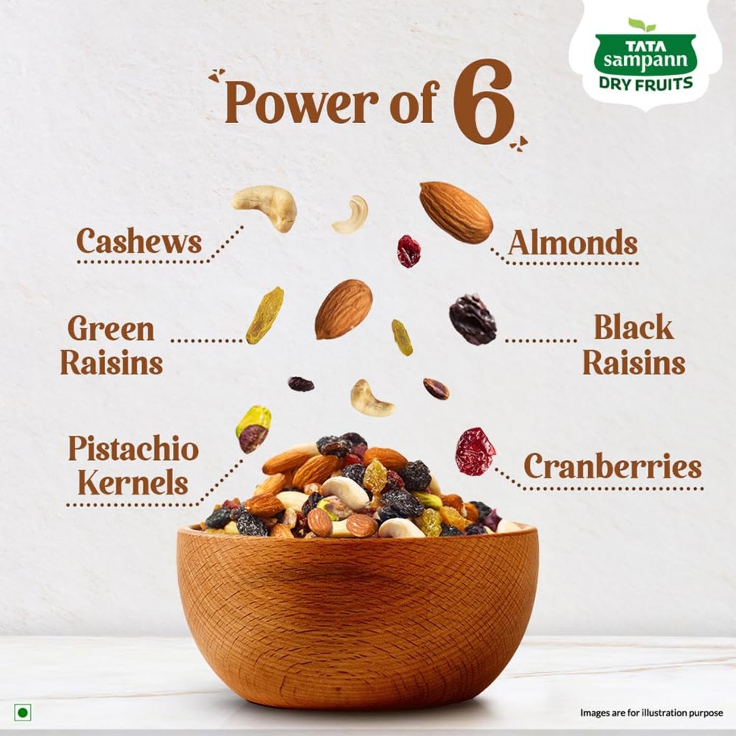 Mixed goodness for wholesome times! Introducing Tata Sampann Dry Fruits & Nuts Mix that contains your favourite almonds black raisins cashews cranberries green raisins and pistachio. It contains 100% premium hand-picked nuts and dry fruits. With up to 20 quality parameters tested Tata Sampann ensures that you only get the choicest selection of nuts and dry fruits. This nuts and dry fruits mix pack from Tata Sampann contains flavourful deluxe-size dry fruits and nuts. With Tata Sampann mixed dry fruits and nuts enjoy a delicious indulgence always! This nutritious snack is a source of protein that contributes to the maintenance of normal bones and is rich in dietary fibre that aids bowel movement. Use this mixed dry fruits pack as a daily evening or pre-breakfast snack as a nutty delight to greet your guests or simply on-the-go snack. Buy Tata Sampann 100% Dry Fruits & Nuts Mix and other products in the range to bring happiness to your loved ones and yourself! Storage Instructions: Store in a cool and dry place.