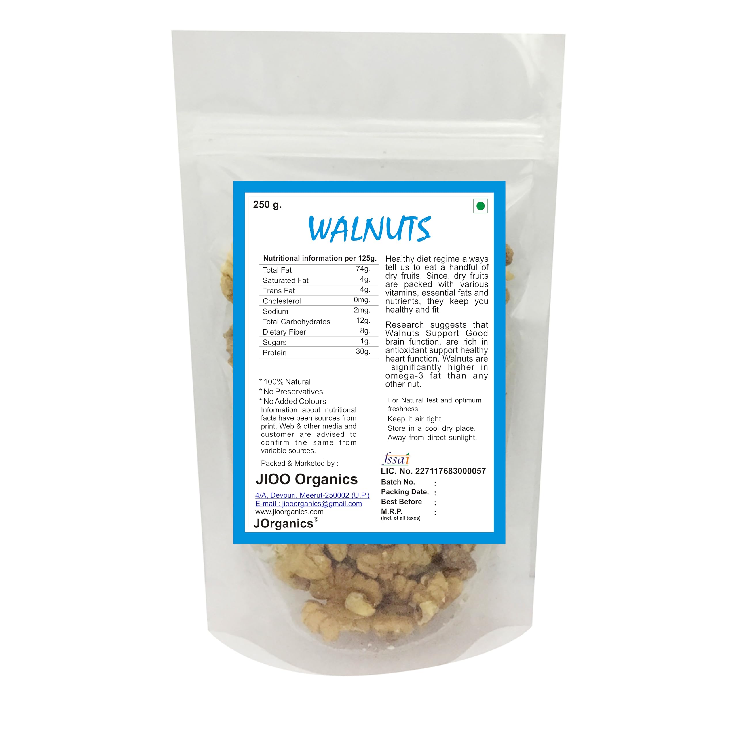 Discover the premium quality walnuts from JOrganics that bring you nature's goodness in every bite. These carefully selected 100% natural walnuts are processed and packed to preserve their fresh delectable taste and signature crunch. Perfect as a healthy snack option these shelled walnuts (akhrot giri) are packed with essential nutrients that make them an ideal addition to your daily diet. Whether enjoyed on their own added to breakfast cereals or incorporated into your favourite recipes these premium walnuts offer both versatility and nutrition. The convenient resealable packaging ensures that your walnuts stay fresh and maintain their natural flavour. Make a smart choice for your snacking needs with these premium quality walnuts that combine taste with wholesome nutrition.