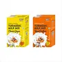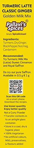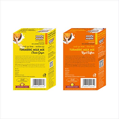 Turmeric Milk Mixes has 1 Royal Saffron and 1 Classic Ginger pack of 50g. One 50g pack each contains 5 sachets of 10g. One sachet is good for 20 cups of 100 ml milk. Quantity can differ according to taste. Popularly known as Haldi-Dudh (Turmeric Latte in West) this is a traditional Indian mix of turmeric ginger Saffron/Ginger & select added in hot milk offering many health benefits You may add jaggery/honey to your taste. Add 1tbsp Desi Ghee in the hot milk (optional). Stir well & serve. Note: Jaggery/honey is not added while boiling the milk. Add it later before serving.