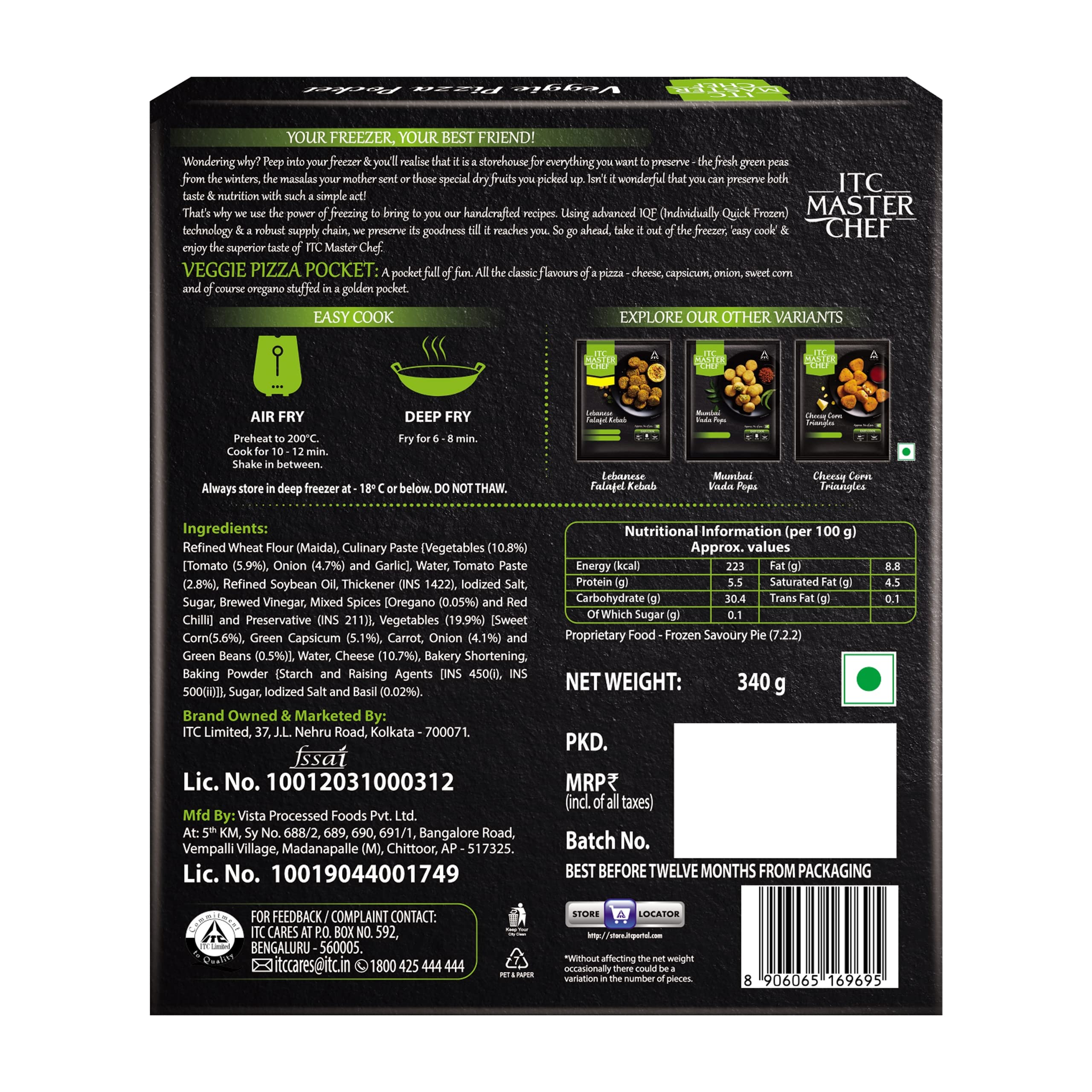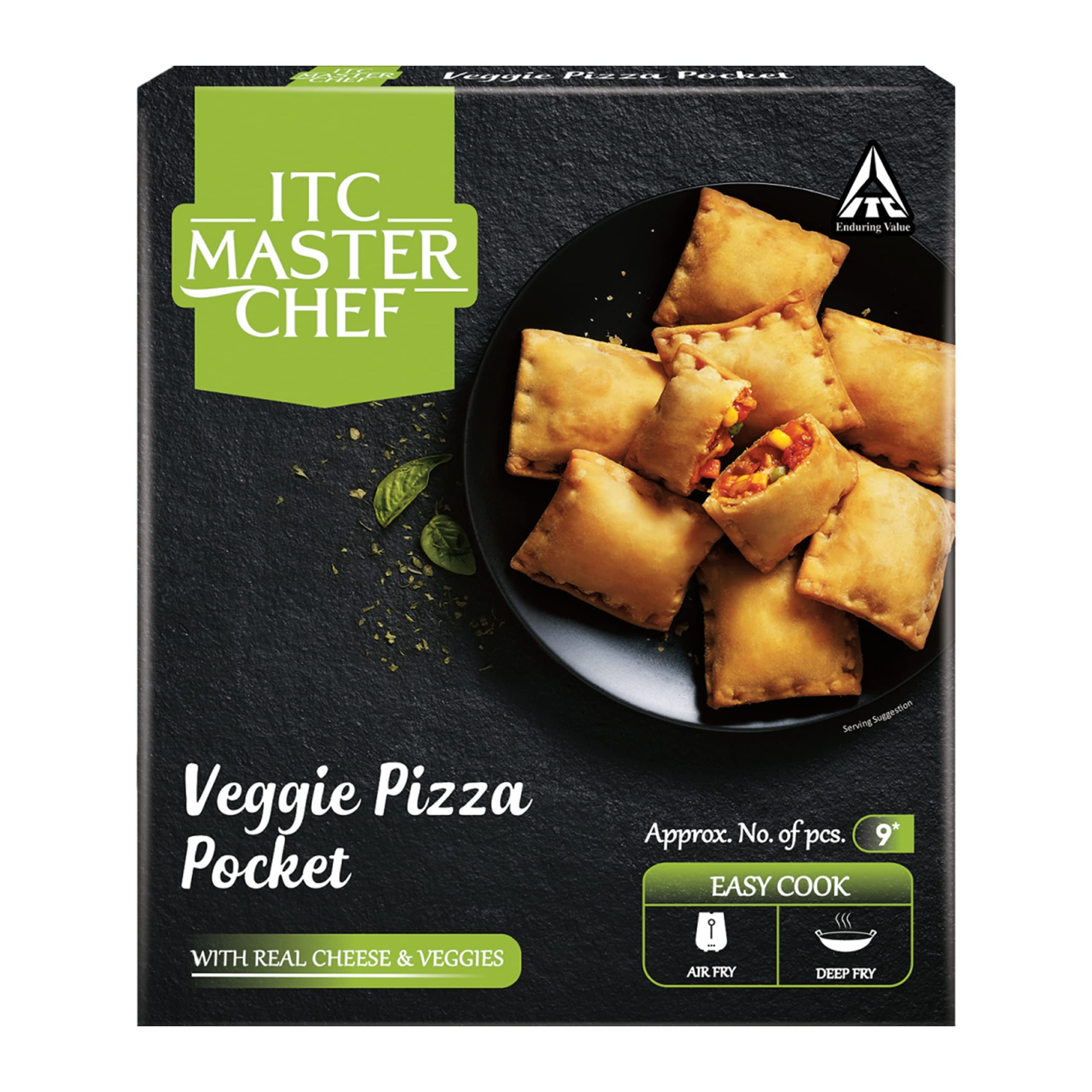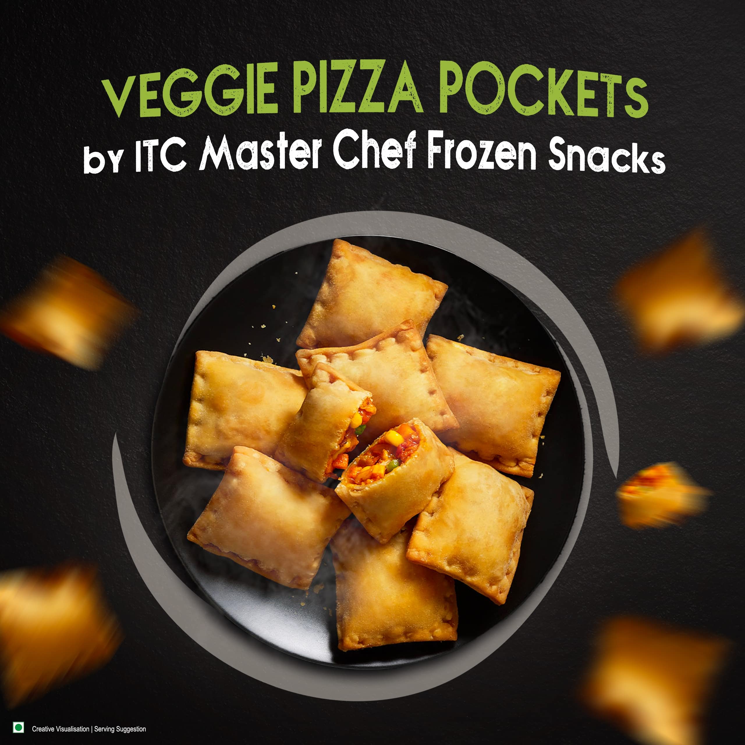The happiness of a slice now packed inside a yummy pocket. Presenting ITC Master Chef Veggie Pizza Pocket a classic pizza treat in small bite-sized pockets or how we like to call it âfun pockets'. This tasty snack is loaded with real cheese and vegetables and can be enjoyed in a matter of minutes. ITC Master Chef's frozen Veggie Pizza Pockets are available in a ready to cook pack. It has a puff coating filled with your classic pizza toppings like capsicum onion sweetcorn and oregano. You can serve this delicious treat with some refreshing drinks or as a spread for house parties. Be it kids or adults everyone is going to love this snack.Each ITC Master Chef frozen food recipe is crafted keeping in mind the tastebuds and preferences of Indian customers. The dishes are frozen using IQF (Individually Quick Frozen) technology which keeps the taste intact till the time you open the pack for cooking. These frozen food products are made with the finest ingredients and come with the promise of the highest quality and taste. You can even pair these frozen snacks with different foods or try out some scrumptious recipes from our website. Experience all the excitement of a pizza with these tasty pizza pockets. Next time you plan a party at home don't forget to get yourself a ready to cook pack of Veggie Pizza Pocket by ITC Master Chef.