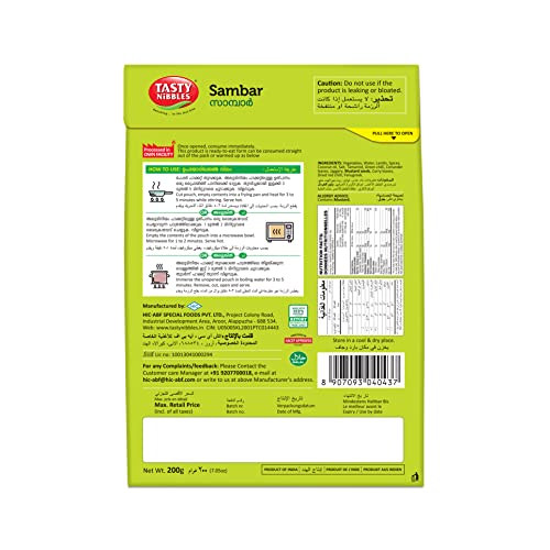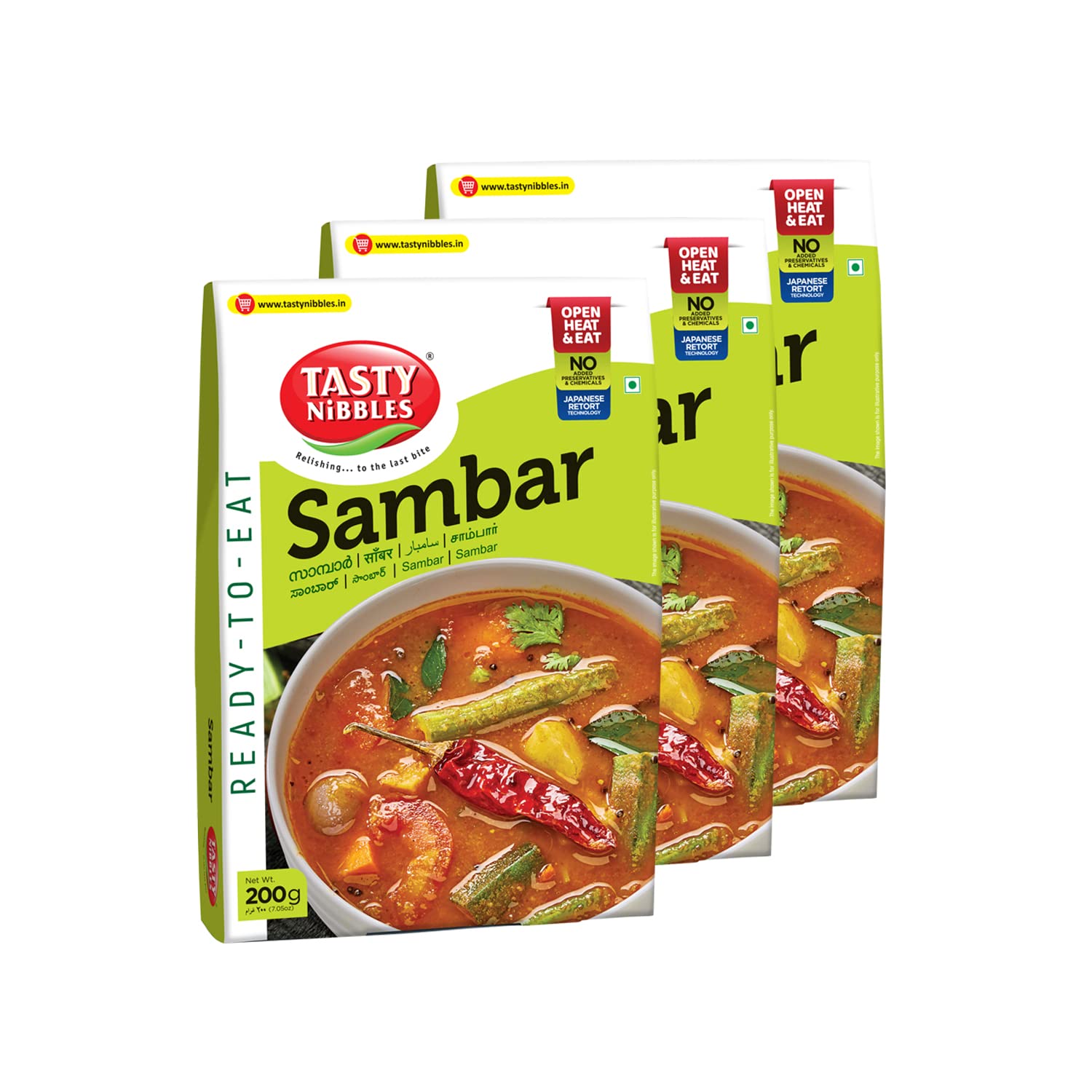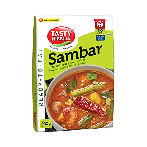 Tasty Nibbles Ready to Eat Sambar curry made hygienically with traditional Kerala recipe using retort technology. No added Preservative No added additives No added color / flavours No added MSG.