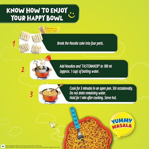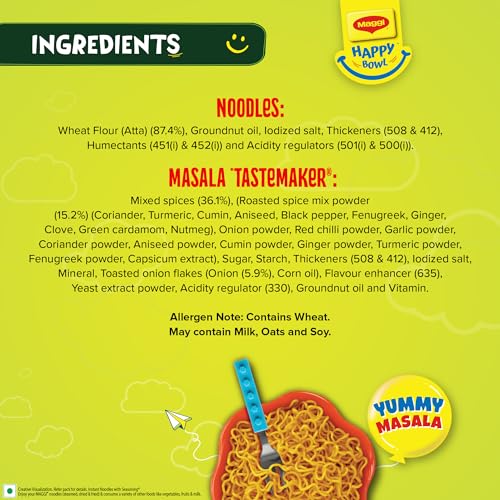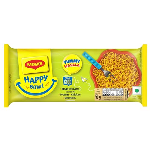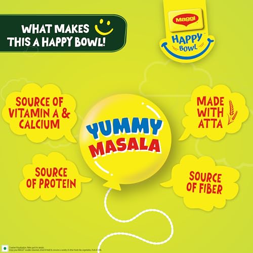 Introducing MAGGI Happy Bowl Instant Noodles noodles made especially for your kids. Get ready for a flavour-packed journey with a delightful Yummy Masala made with Atta noodles that will make every bite a fun-filled experience. The noodles are also a source of Fiber Protein Vitamin A and Calcium. This truly good choice will make your kids' taste buds happy! Storage Advice: Store in a cool dry & hygienic place to protect from insects pests & strong odours.