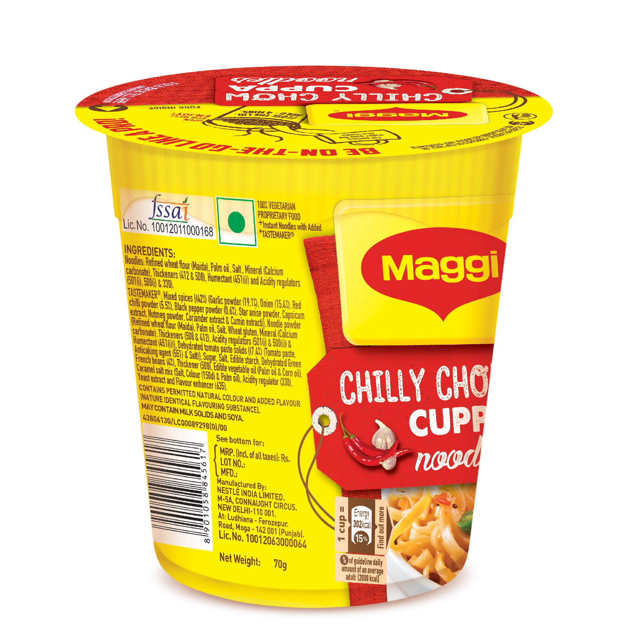 Your on-the-go noodles Maggi Cuppa offers you the delicious taste of Maggi combined with the convenience of cup noodles! It is an ideal offering for the new generation pressed hard for time trying to juggle multiple roles all at once & can be enjoyed anytime on the go.Containing a delicious Chinese masala taste Maggi Cuppa noodles are made with the finest quality spices and ingredients. The pack comes with Tastemaker already added and a fork inside for maximum convenience even on the go.Usage Instructions: When you are on the trail and hunger hits grab a Cuppa add boiling water and wait just 4 minutes for your awesome snack. In no time you’ll be back on track. Serving Instructions: Serve hot Allergens: May contain milk solids and soya. Storage Instruction: Store in a cool dry and hygienic place to protect from insects pests and strong odours.