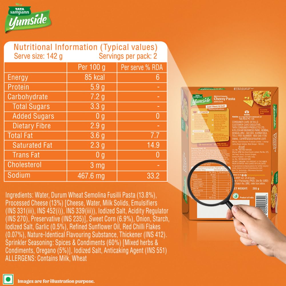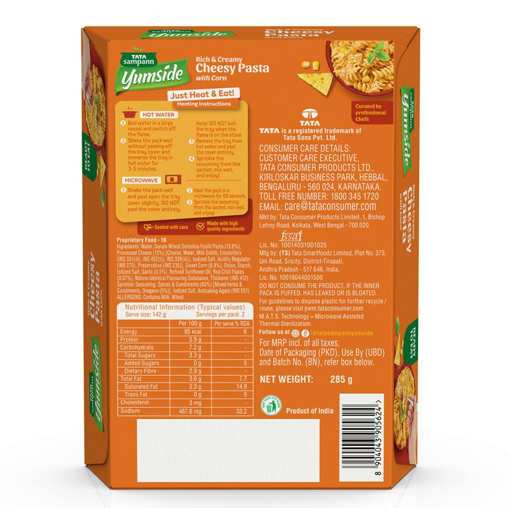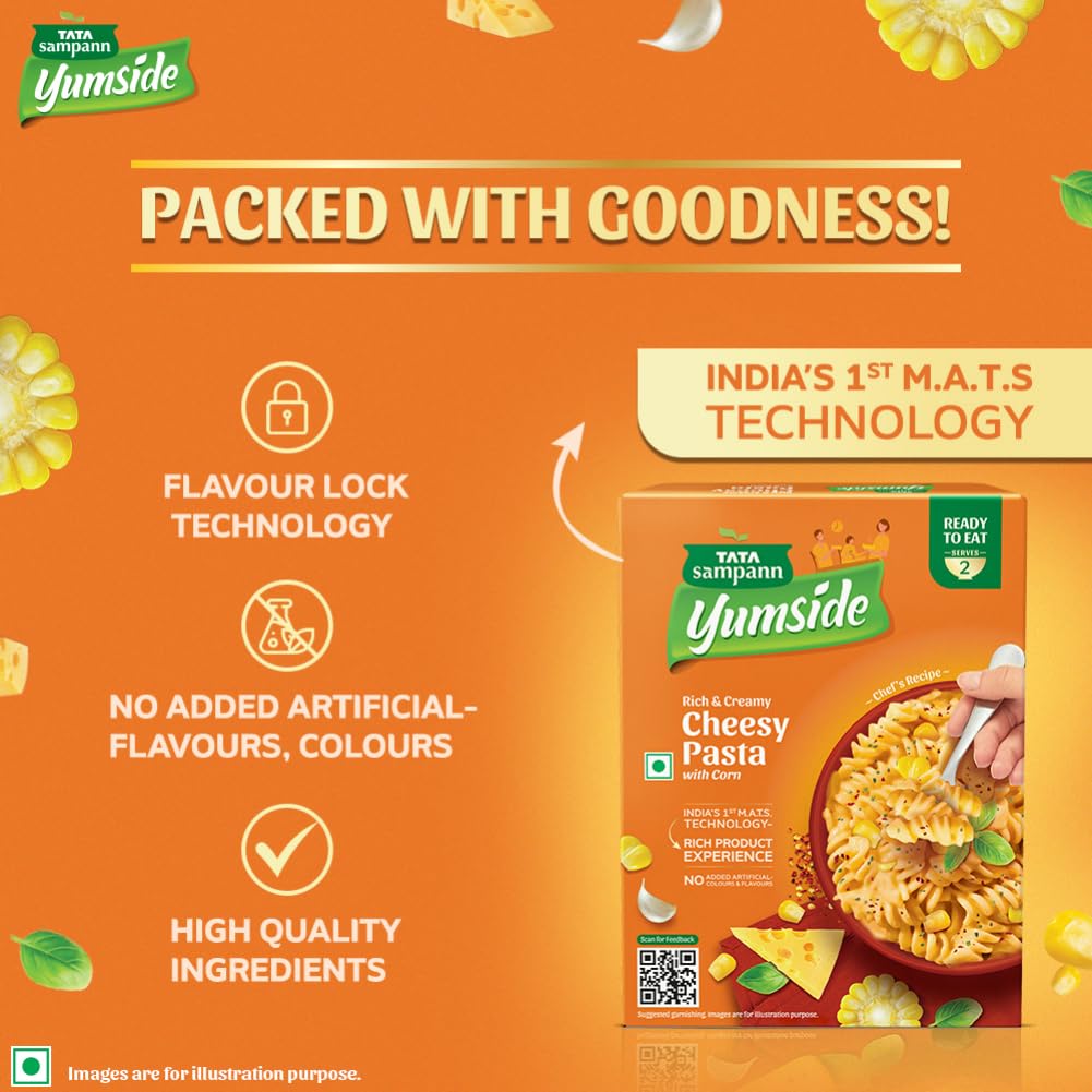 YUM MEAL WITH GOODNESS - An instant solution to your cravings! Looking for an instant and convenient way to kill those hunger pangs? Your search ends with Tata Sampann Yumside ready to eat meals which are made from high-quality ingredients and curated by professional chefs. Loaded with Corn and tossed in cheese sauce this rich and creamy instant pasta will satisfy your pasta cravings anytime! For times when you or your family crave something delicious for lazy days for treat days for days when you're running out of time for days when you just want to have more time for life! - This ready-to-eat meal comes to the rescue. All you have to do is heat the pack in the microwave for 60 seconds or immerse the tray in hot water for 3-5 mins and your instant meal is ready! Doesn't it sound great? Sprinkle the seasoning from the sachet mix well and enjoy! Enjoy a rich experience Tata Sampann Yumside ready-to-eat instant pasta is sealed with care using India's first Microwave Assisted Thermal Sterilization (M.A.T.S) Technology to offer you a rich product experience. For a delicious twist sprinkle the mixed herb seasoning provided with the pack. Storage Instructions: Store in a cool and dry place. It does not require refrigeration. Consume immediately once the pack is opened. Do not consume if the inner pack is puffed bloated or leaked.