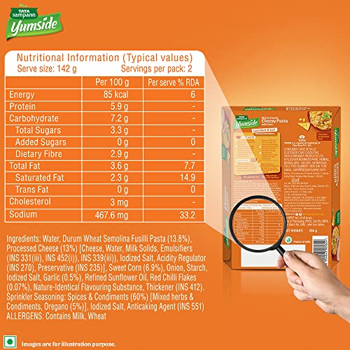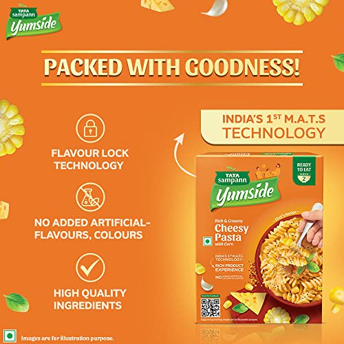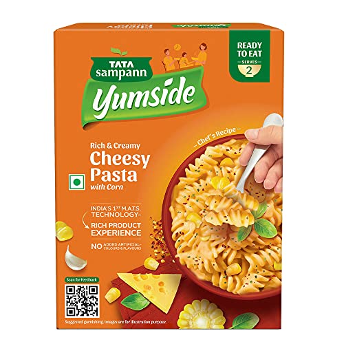 YUM MEAL WITH GOODNESS - An instant solution to your cravings! Looking for an instant and convenient way to kill those hunger pangs? Your search ends with Tata Sampann Yumside ready to eat meals which are made from high-quality ingredients and curated by professional chefs. Loaded with Corn and tossed in cheese sauce this rich and creamy instant pasta will satisfy your pasta cravings anytime! For times when you or your family crave something delicious for lazy days for treat days for days when youre running out of time for days when you just want to have more time for life! - This ready-to-eat meal comes to the rescue. All you have to do is heat the pack in the microwave for 60 seconds or immerse the tray in hot water for 3-5 mins and your instant meal is ready! Doesn't it sound great? Sprinkle the seasoning from the sachet mix well and enjoy! Enjoy a rich experience Tata Sampann Yumside ready-to-eat instant pasta is sealed with care using Indias first Microwave Assisted Thermal Sterilization (M.A.T.S) Technology to offer you a rich product experience. For a delicious twist sprinkle the mixed herb seasoning provided with the pack. Storage Instructions: Store in a cool and dry place. It does not require refrigeration. Consume immediately once the pack is opened. Do not consume if the inner pack is puffed bloated or leaked.