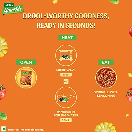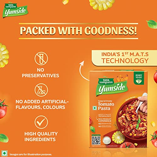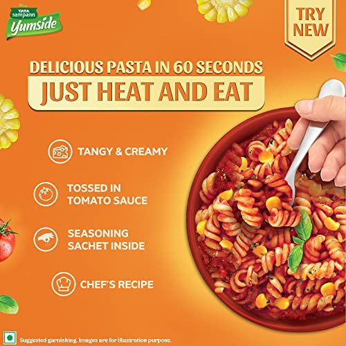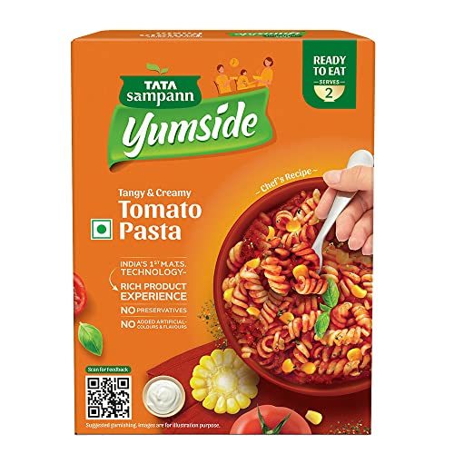 YUM MEAL WITH GOODNESS - An instant solution to your cravings! Looking for an instant and convenient way to kill those hunger pangs? Your search ends with Tata Sampann Yumside ready to eat meals which are made from high quality ingredients and curated by professional chefs. Loaded with Corn and tossed in a luscious tomato sauce this tangy and creamy instant pasta will satisfy your pasta cravings anytime! For times when you or your family crave something delicious for lazy days for treat days for days when you're running out of time for days when you just want to have more time for life! - This ready-to-eat meal comes to the rescue. All you have to do is heat the pack in the microwave for 60 seconds or immerse the tray in hot water for 3-5 mins and your instant meal is ready! Doesn't it sound great? Sprinkle the seasoning from the sachet mix well and enjoy! Enjoy a rich experience Tata Sampann Yumside ready-to-eat instant pasta is sealed with care using India's first Microwave Assisted Thermal Sterilization (M.A.T.S) Technology to offer you a rich product experience. For a delicious twist sprinkle the mixed herb seasoning provided with the pack. Storage Instructions: Store in a cool and dry place. It does not require refrigeration. Consume immediately once the pack is opened. Do not consume if the inner pack is puffed bloated or leaked.