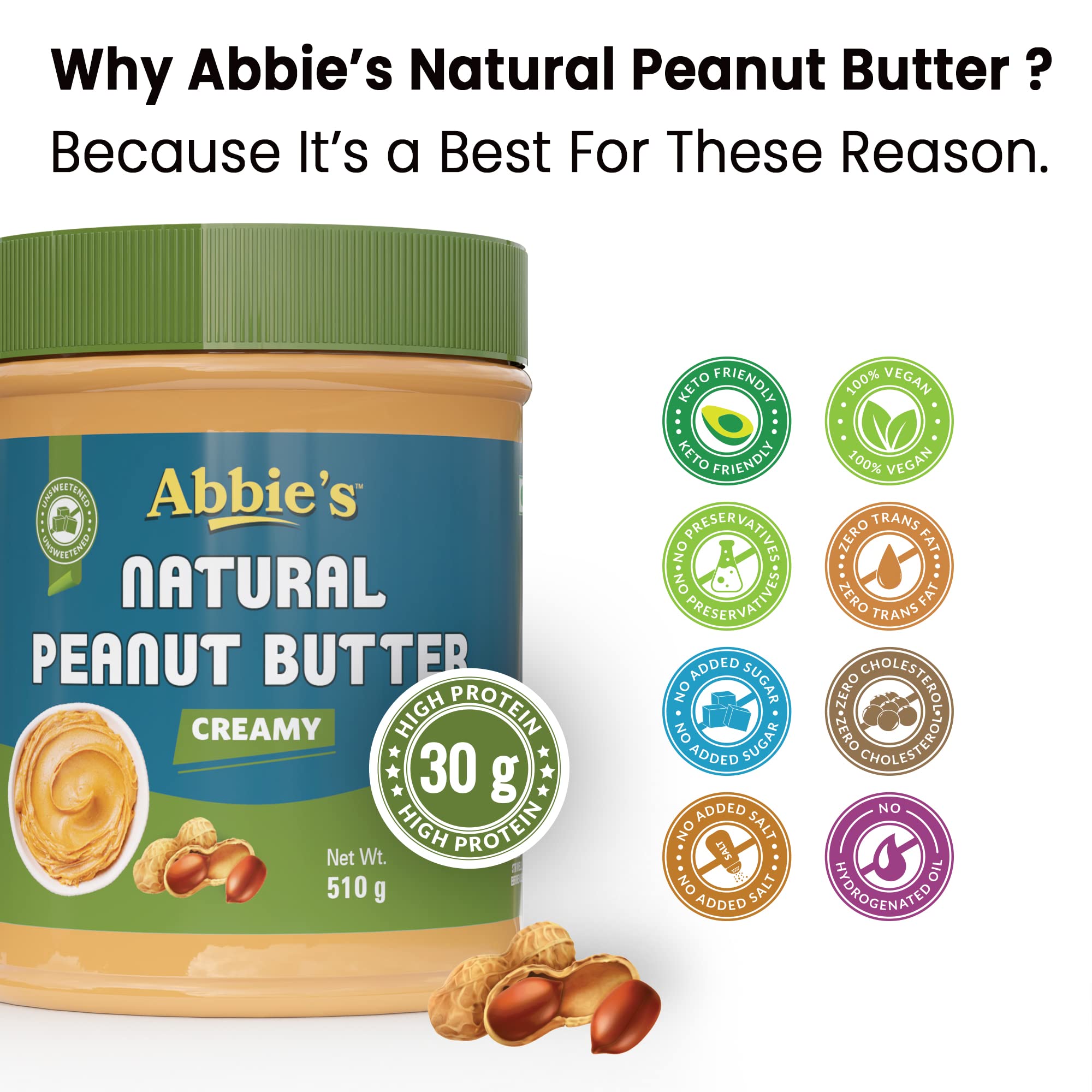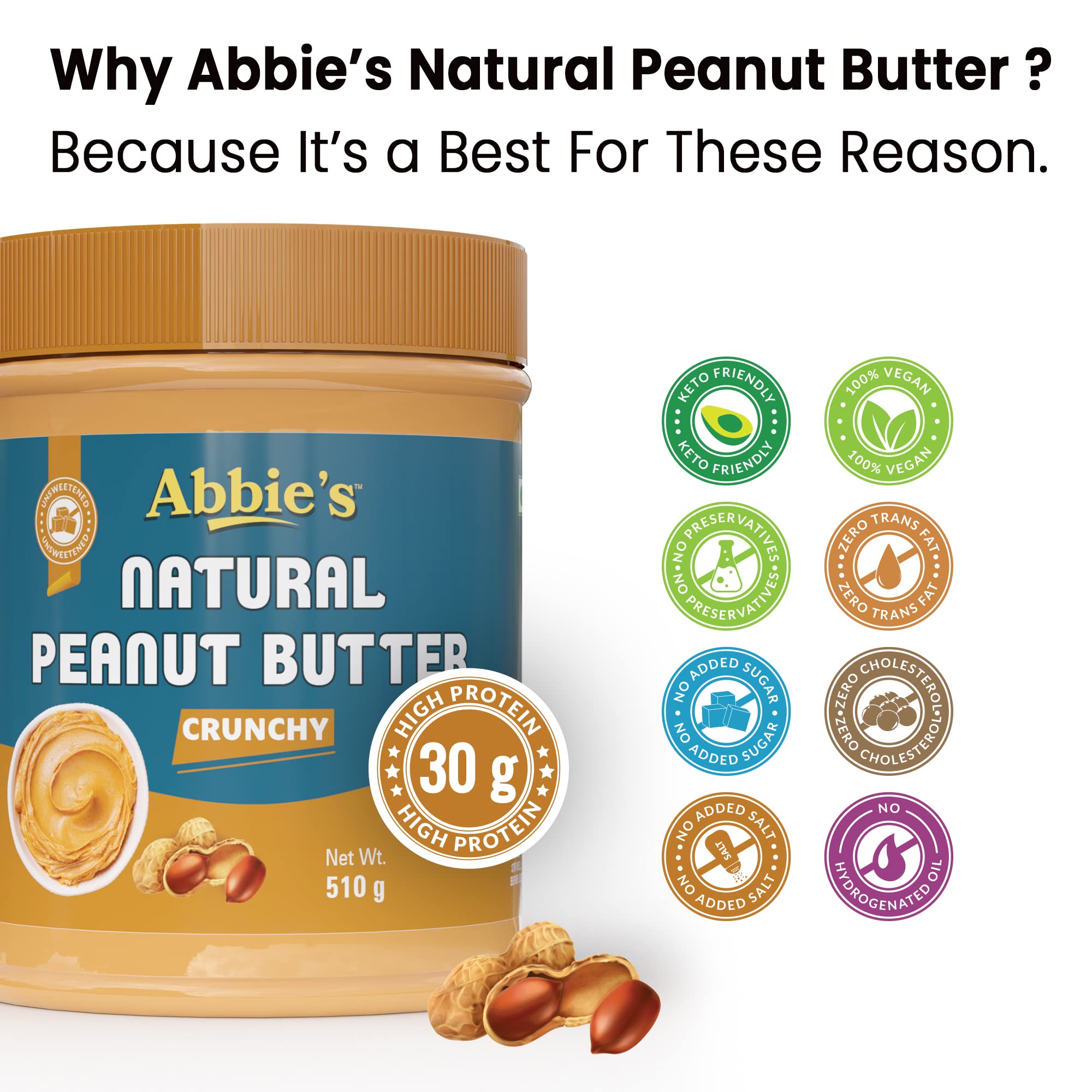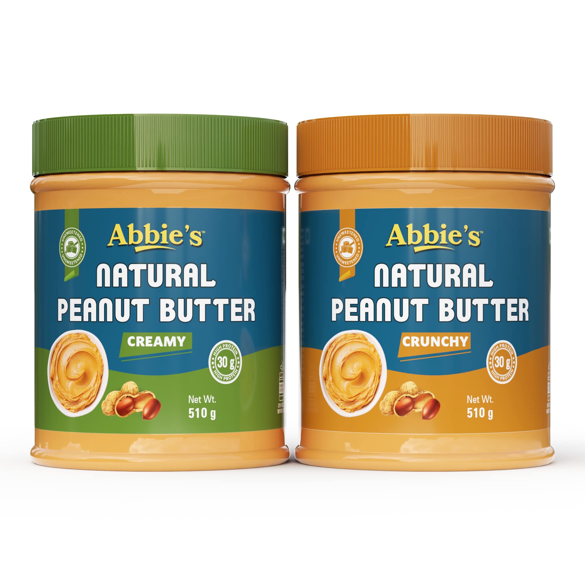 HomeGroceryFlavorsNut & Seed ButterAbbie's Natural Peanut Butter Creamy and Crunchy (510g-Pack of 2) with 30g Protein Per 100g Serving No Added Sugar/Salt Zero Trans Fat Good Source of Fat for Athletes Body Builders