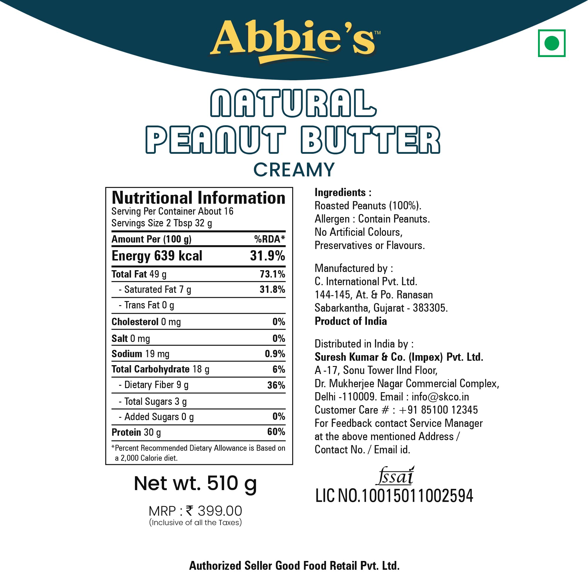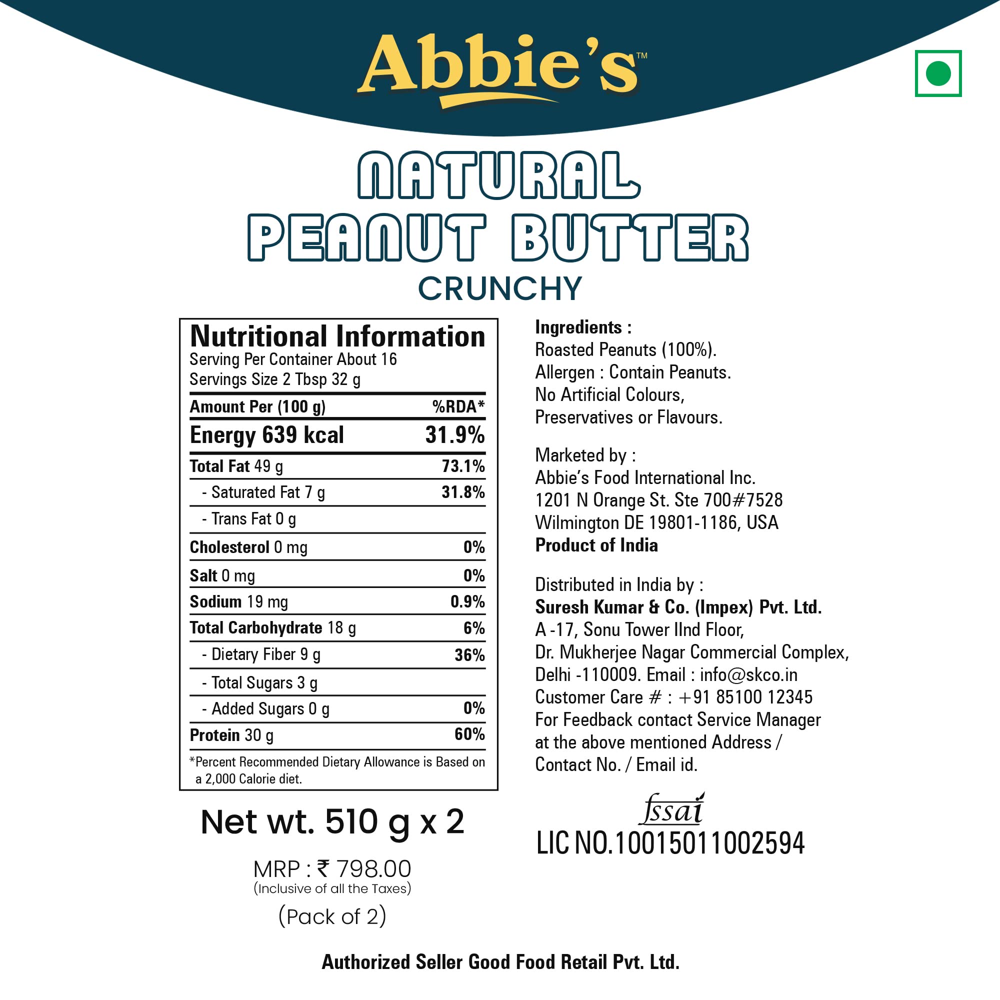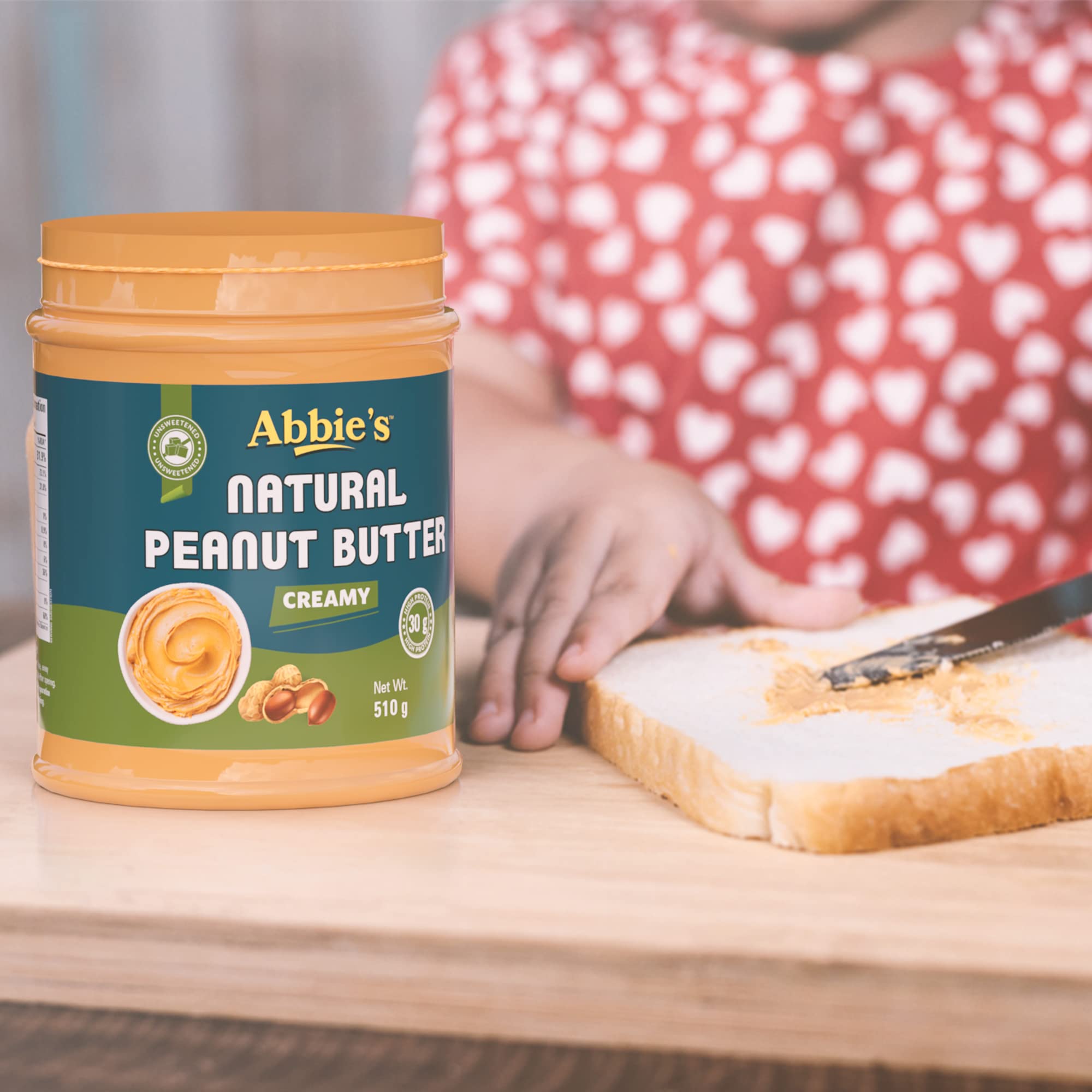 HomeGroceryFlavorsNut & Seed ButterAbbie's Natural Peanut Butter Creamy and Crunchy (510g-Pack of 2) with 30g Protein Per 100g Serving No Added Sugar/Salt Zero Trans Fat Good Source of Fat for Athletes Body Builders