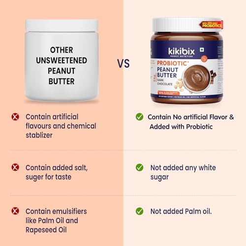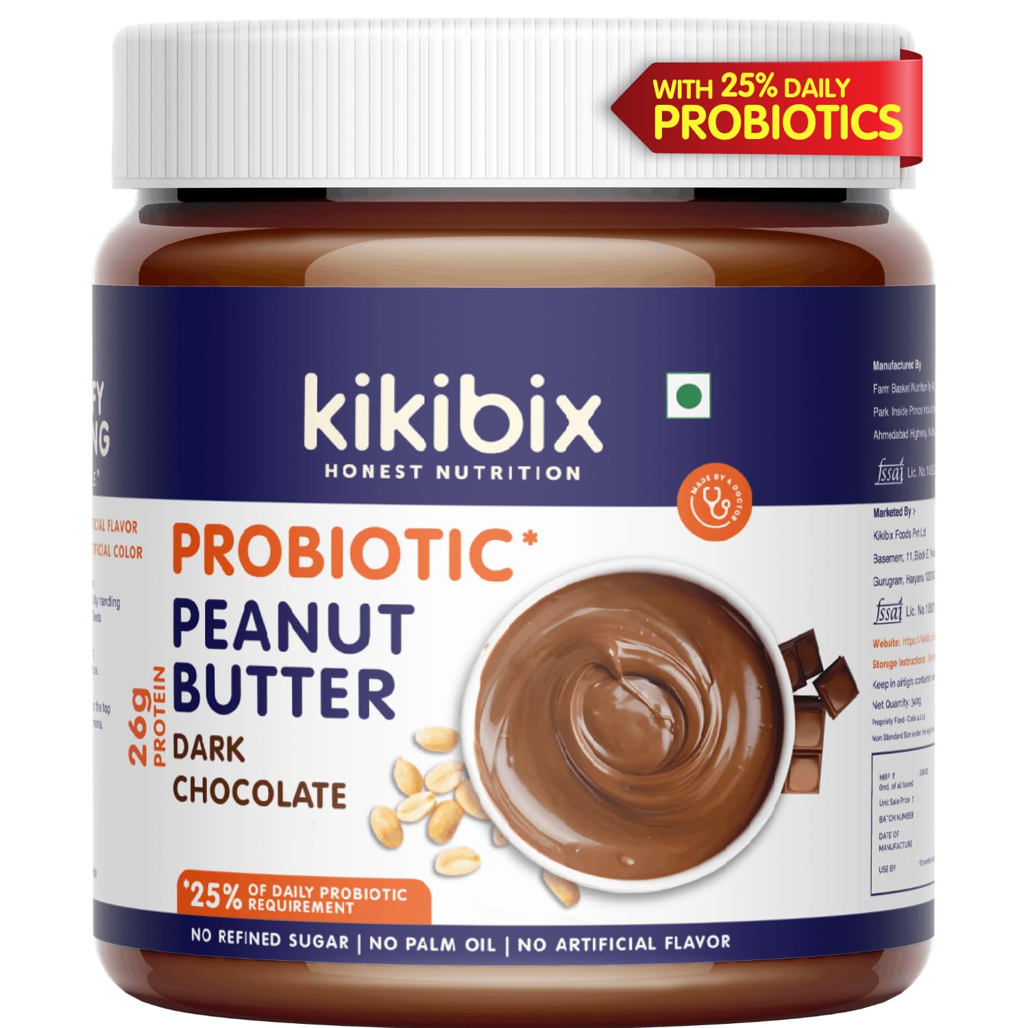 Kikibix All Natural Dark Chocolate Peanut Butter 26g Protein No Refined Sugar Pure Chocolate No Added Oil No Transfat Added Probiotic- 25% Daily Requirement 340 gm