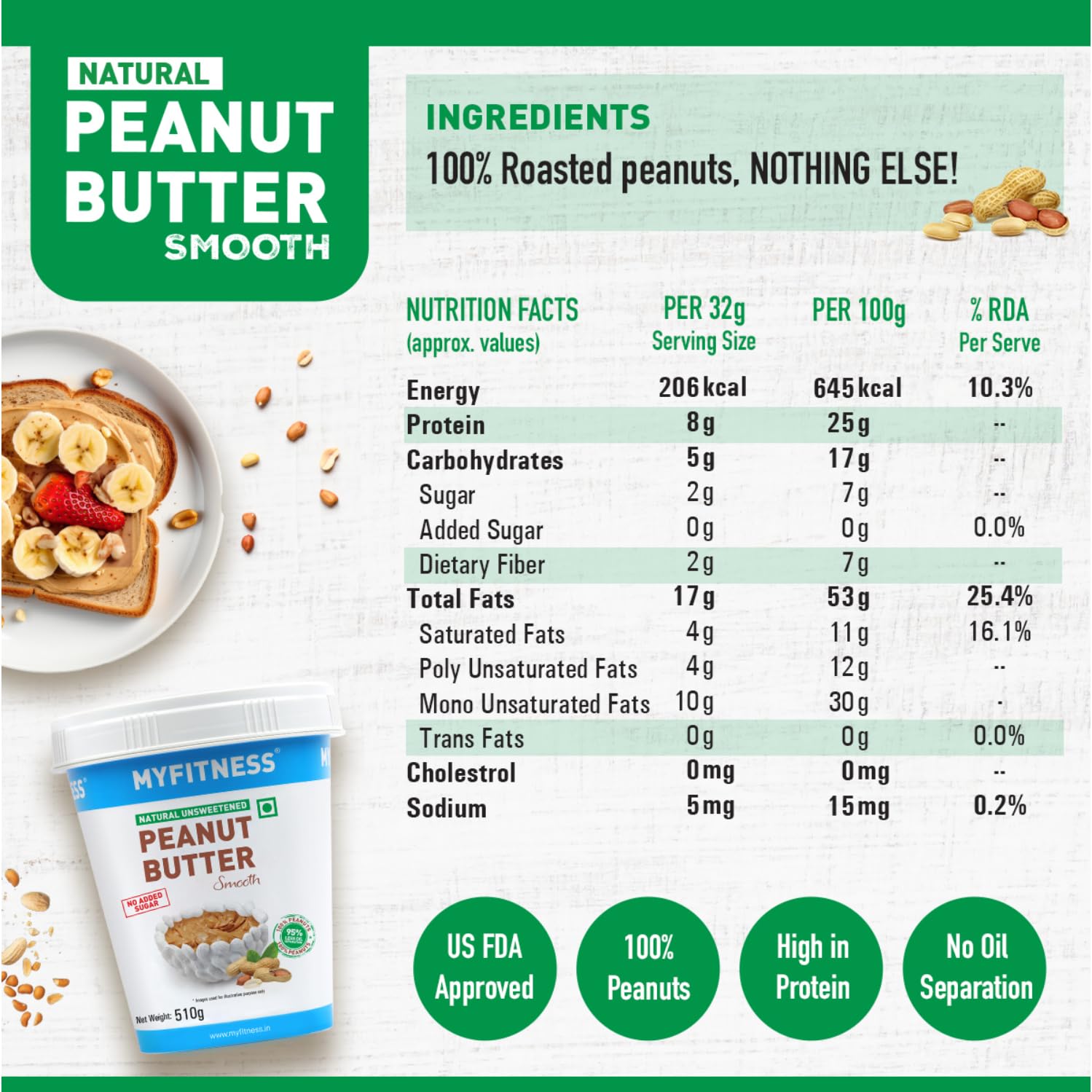 HIGH IN PROTEIN Every 100g serving of MYFITNESS All Natural Smooth Peanut Butter spread is packed with 25g of protein. It is a healthy way to complete your protein intake for the day.