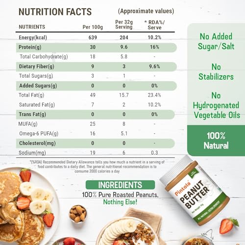 Do you like crunchy over creamy? Try this extra crunchy product from pintola. Pintolas all natural peanut butter is made up from the finest grade fresh crunchy and nutritious peanuts from an iso 22000 haccp and brc (european standards) certified and fssai approved factory. This product is the purest form of peanut butter and we specially introduced for gym goers dieters and joggers. Keep in your bag for getting instant energy anywhere anytime. All natural peanut butter is an unsweetened and loaded with protein fibre and good fats. Note: there may be oil separation on top of the jar as there is no stabilizer in the product. Please stir it back in every time you use. Try to finish the peanut butter within two months after the opening seal.