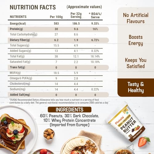 HIGH IN PROTEIN & FIBER - Pintola Dark Chocolate High Protein Peanut Butter contains 30g of protein and 6.2g of dietary fiber per 100g. This makes it an excellent source of protein and dietary fiber without compromising on taste.